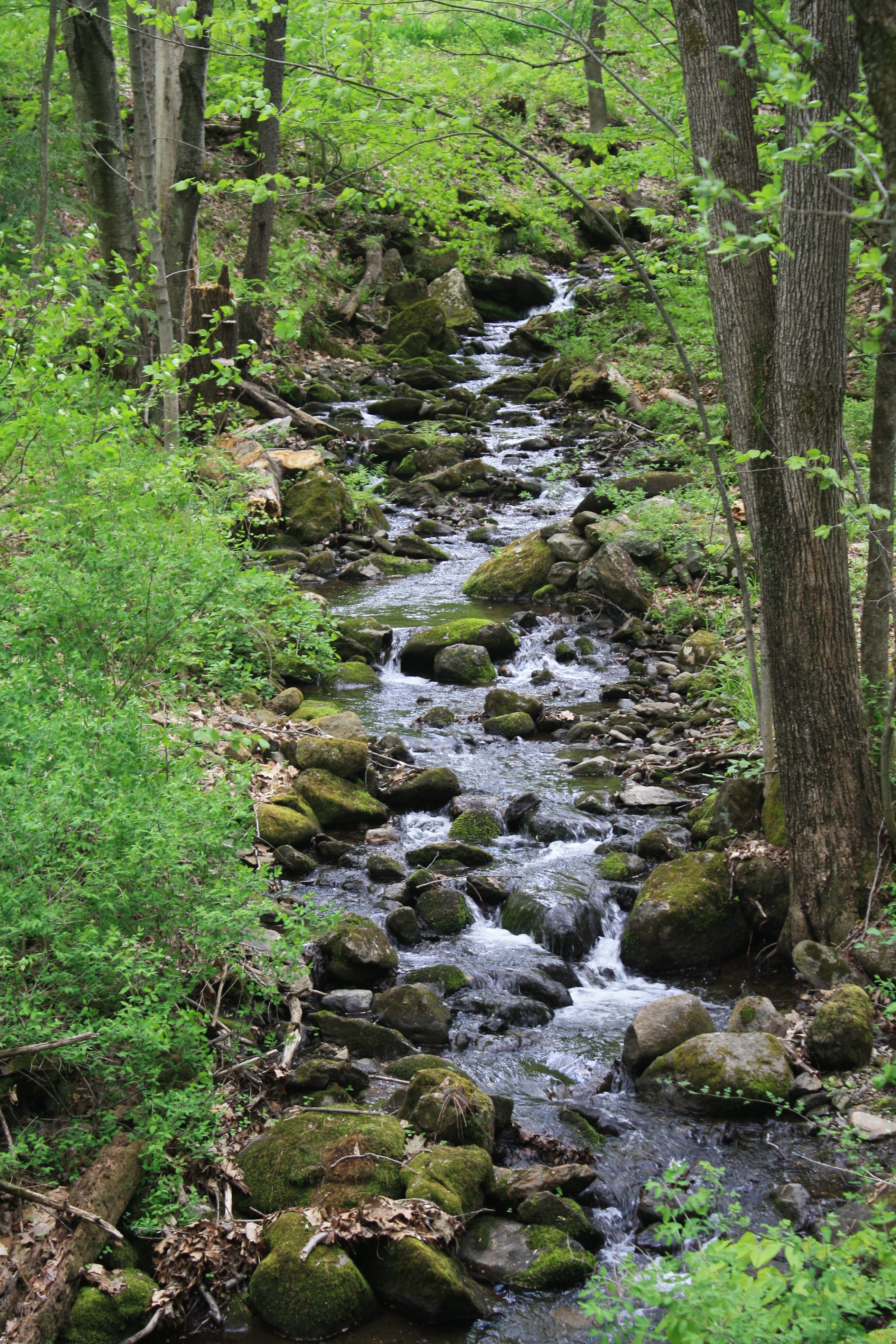 Sunlight dapples the shade through the hardwood canopy, touching the moss-covered stones in the dark stream-bed like a spotlight highlighting different features every hour. Its music soothes, cares melt away, flowing with the water out to the sea.