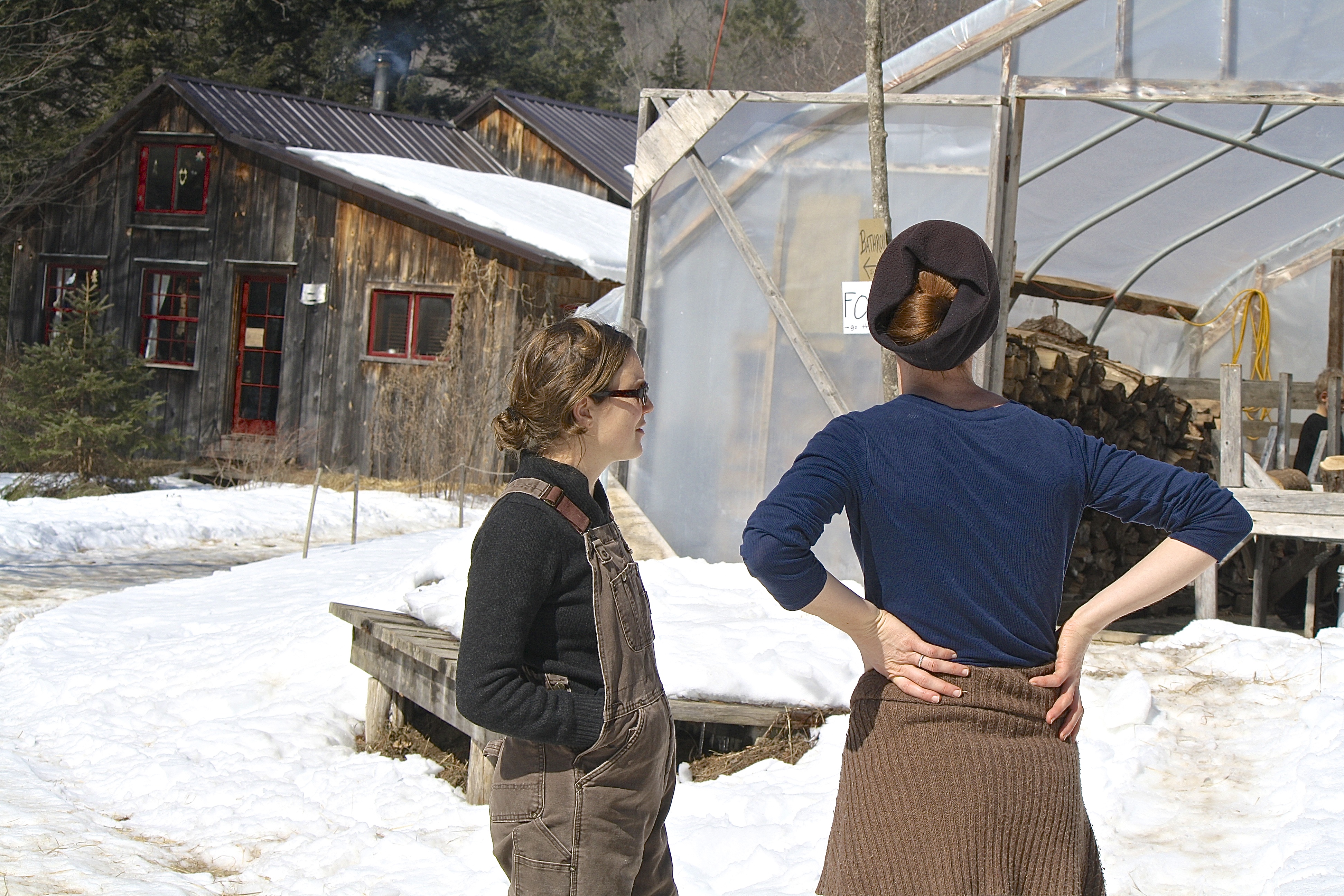 Farmer Anna (right) discusses food set-up & childcare with volunteer. Their greenhouse & home are in the background.