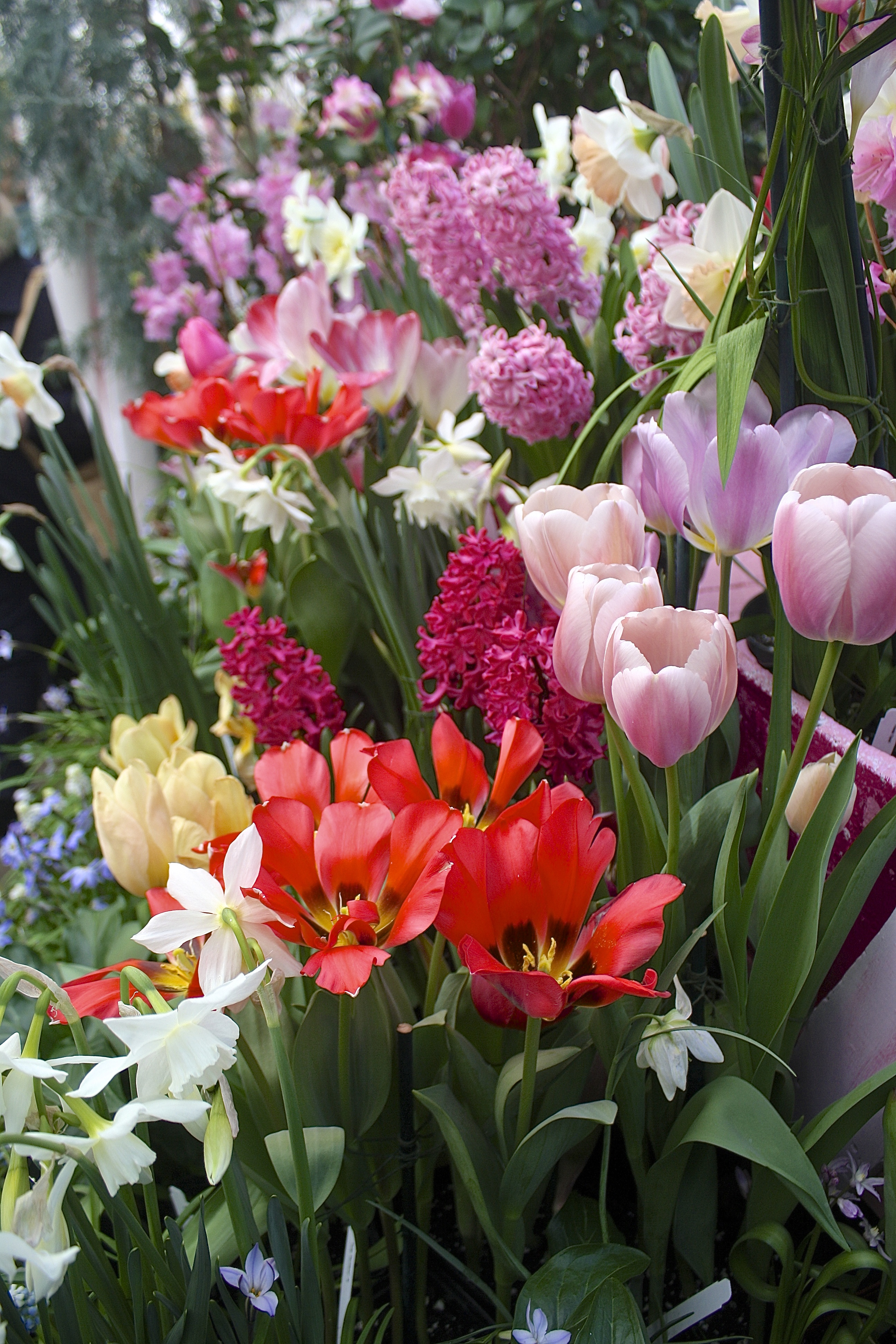 For two weeks every March, Smith College’s Lyman Conservatory in Northampton, Massachusetts hosts a spring bulb show. Two greenhouses are chock-full of forced narcissus, tulips and many types of miniature bulbs as well as branches of spring flowering shrubs such as forsythia, cherry and viburnum. All are tucked artfully together to create a riot of color. It is very well-attended and they receive thousands of visitors over the period the show runs. (It is not for the agoraphobic!) But for those who do choose to wade through the crowds, it is a balm for the winter-weary soul.
