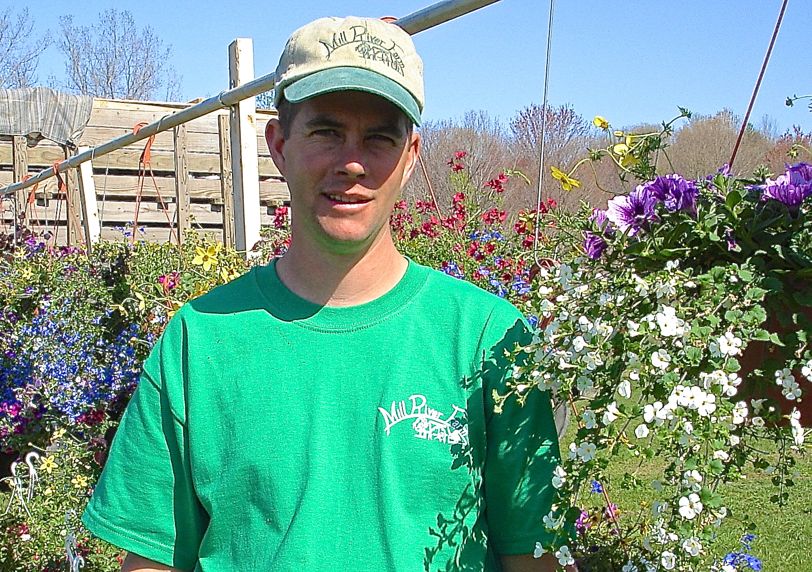 Meet Brent Young, owner of Mill River Farm, who has become a familiar sight at the junction of Routes 116 and 5&10 in South Deerfield weekends April through June. Known to many simply as “the flower guy” for the past twenty-eight years, he has offered for sale a colorful, traffic-stopping display of flowering annuals, perennials, vegetables and herbs grown in his four greenhouses.