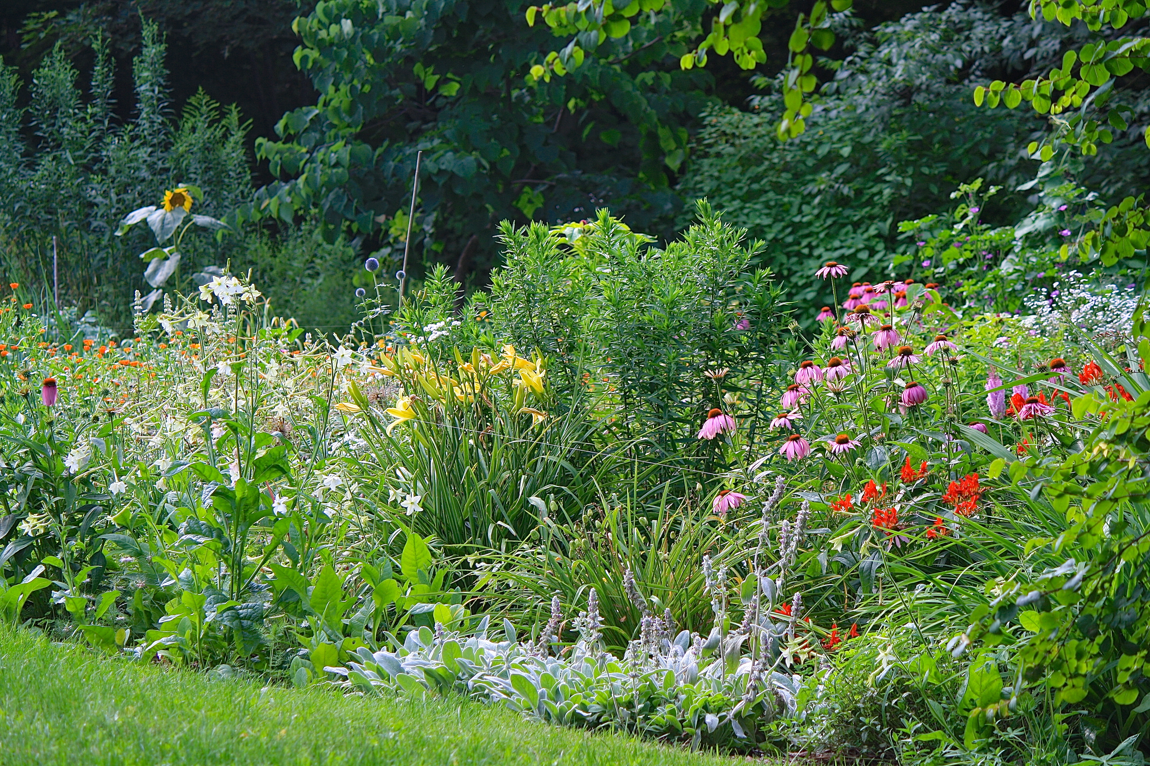 Here’s the largest garden in the backyard at the beginning of August. Since we eat three meals a day seated on the deck (weather permitting), I try to make this vibrant all summer long. The highlights are flaming orange-red Crocosmia ‘Lucifer’, Coneflower (Echinacea purpurea), Yellow Daylily (Hemerocallis ‘Hyperion’) and self-sown white Flowering Tobacco (Nicotiana alata). Out of sight, pink, purple and white Cleome (C. hassleriana) and Sunflowers (Helianthus annuus) add height and color to the back. White and pink Phlox (P. paniculata) and New England Aster (Symphyotrichum novae-angliae) will follow shortly.