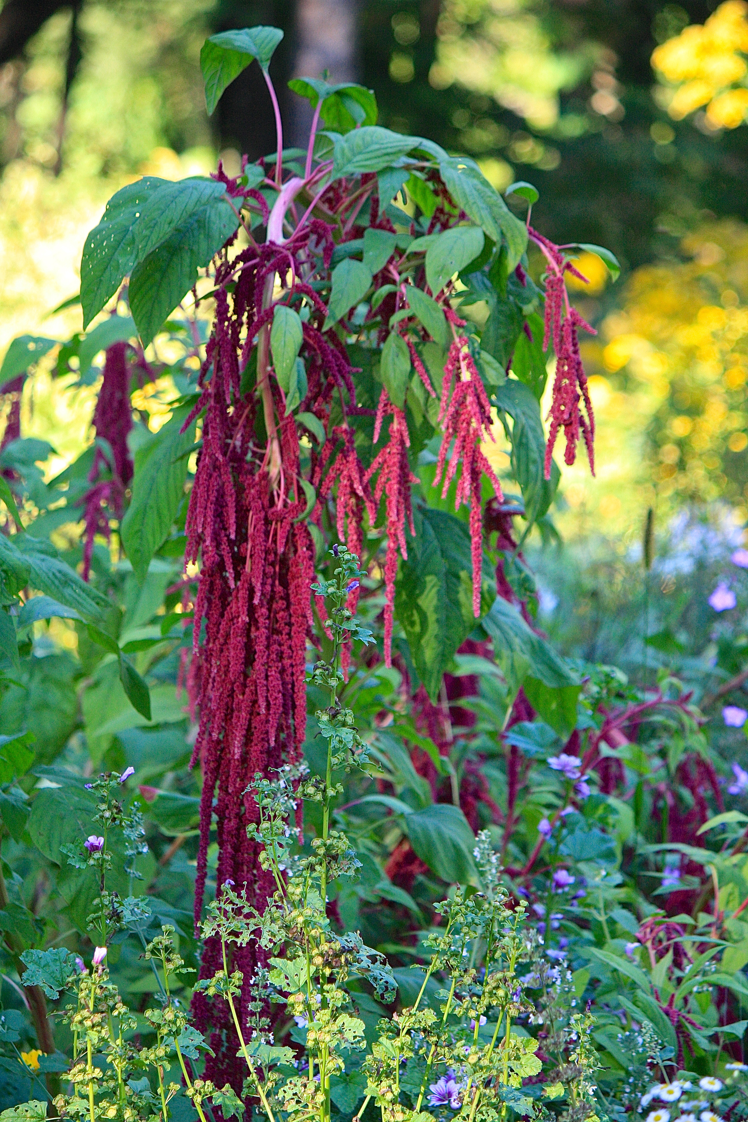 Love-lies-bleeding (Amaranthus caudatus) is a marvelous annual with its pendulous flowers looking like burgundy dreadlocks! Goldenrod in the background provides a nice contrast.