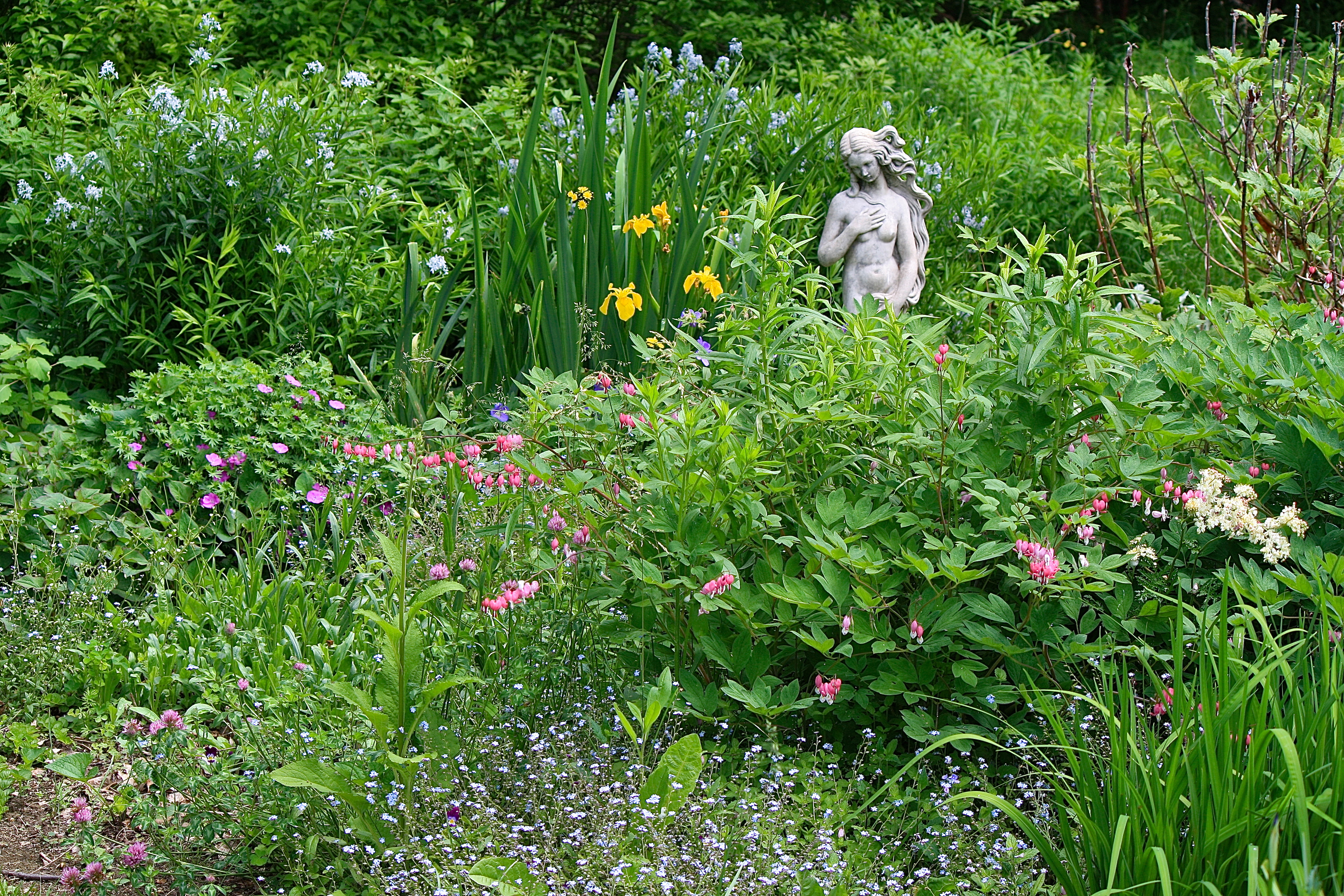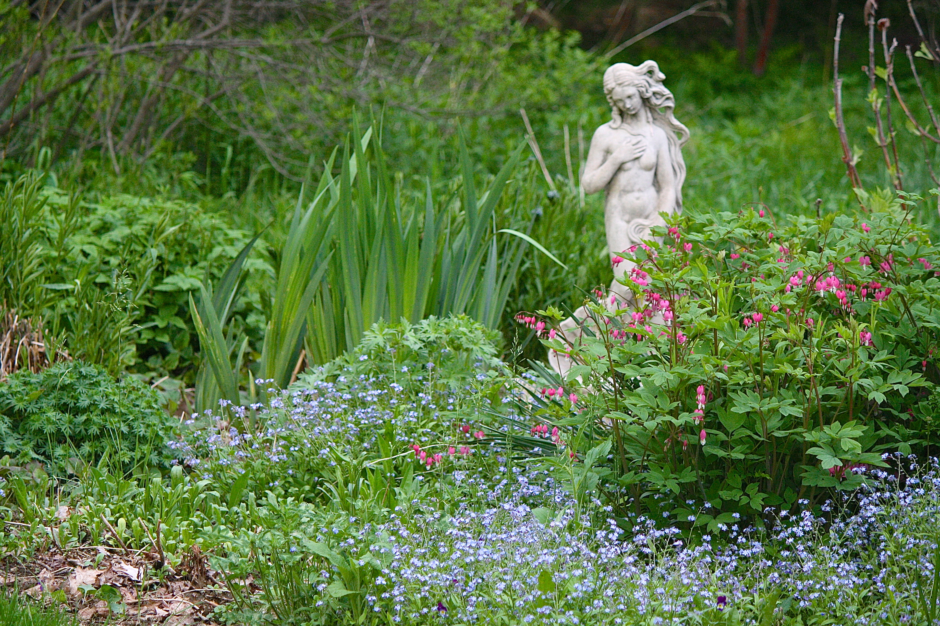 A statue of Botticelli’s Venus, the Roman goddess of Love, overlooks a Bleeding Heart (Dicentra spectabilis) and Forget-me-nots (Myosotis sylvatica). Molto romantico!
