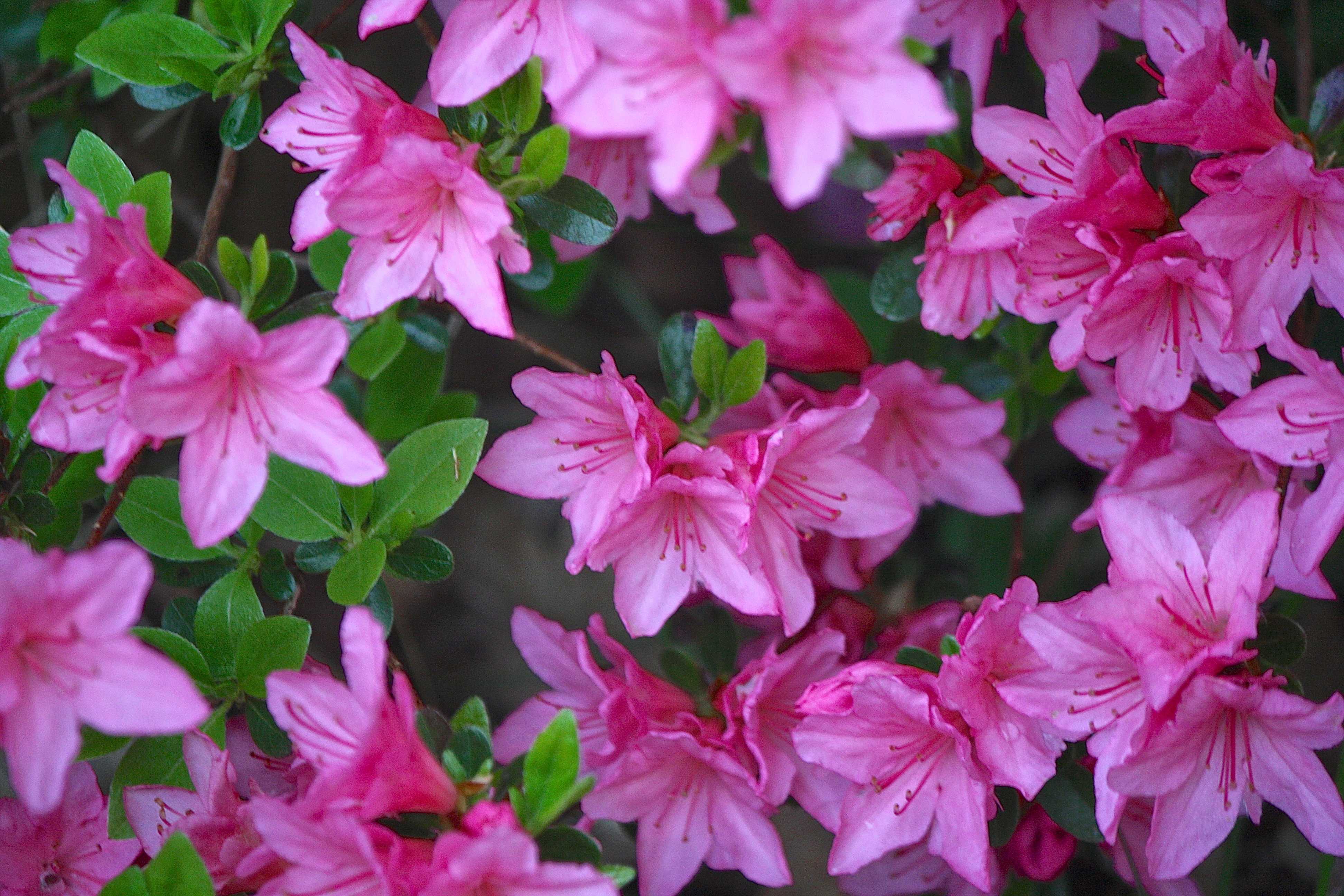Below, this pink Azalea (Rhododendron sp.) on the west side of the house bloomed like crazy. Such a cheerful pink and the bumble bees loved it.