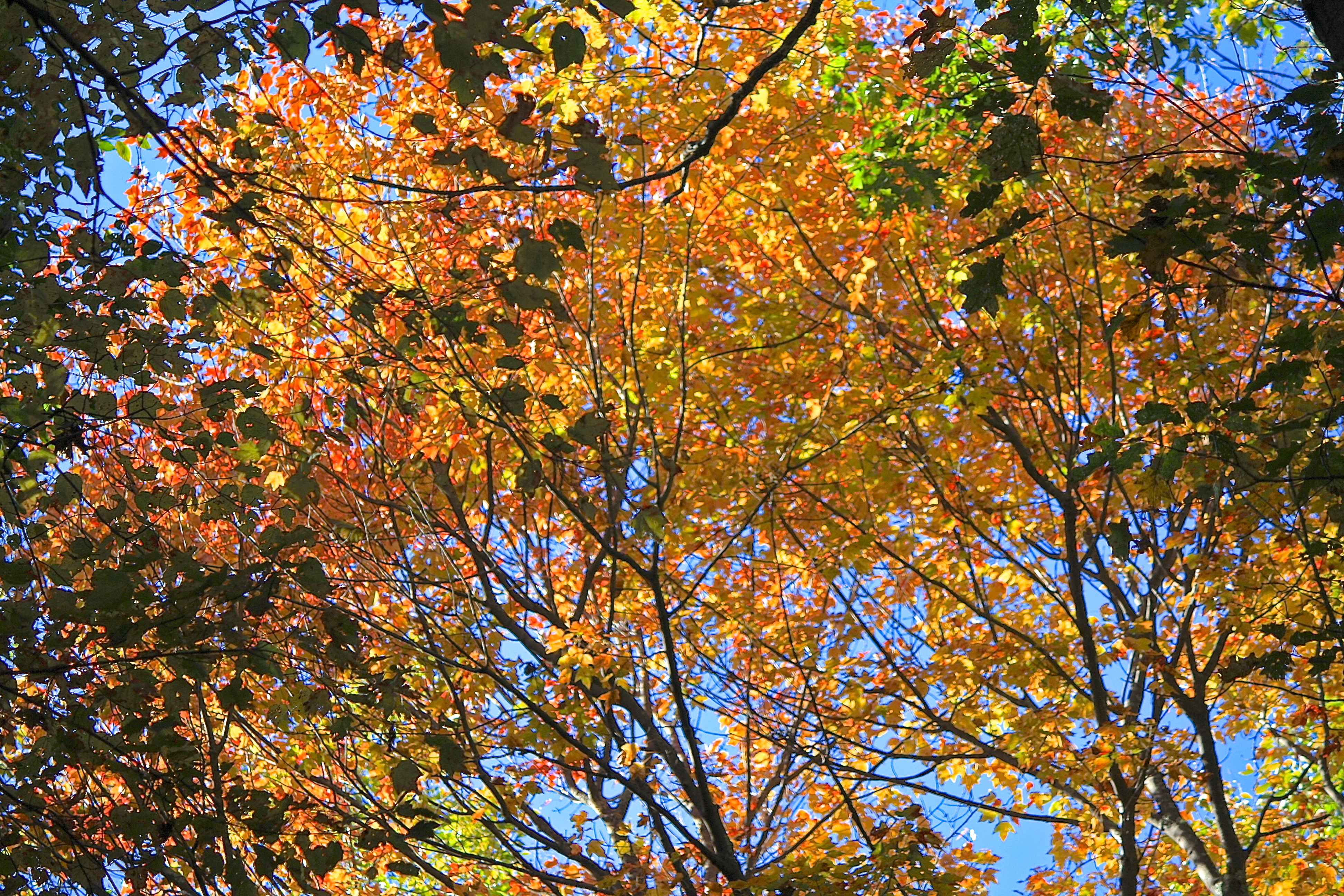 I love to look up through the tree canopy to the sky above in any season, but in autumn with the foliage on fire, this practice fills me with wonder and delight.