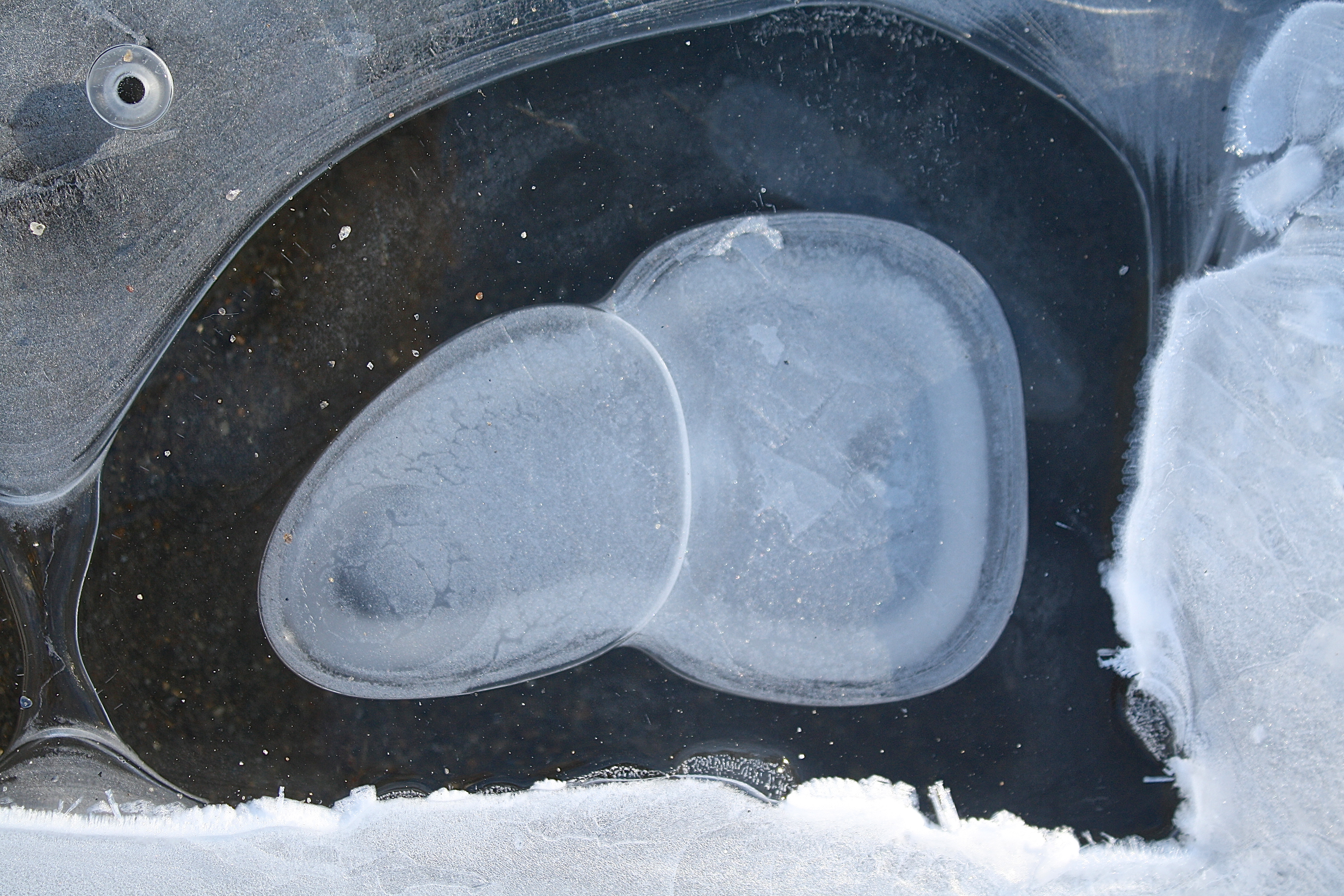 These bubbles trapped in ice looked to me like cells dividing. The one on the left even has a nucleus. Note the ‘bullet hole’ bubble in the upper left corner.