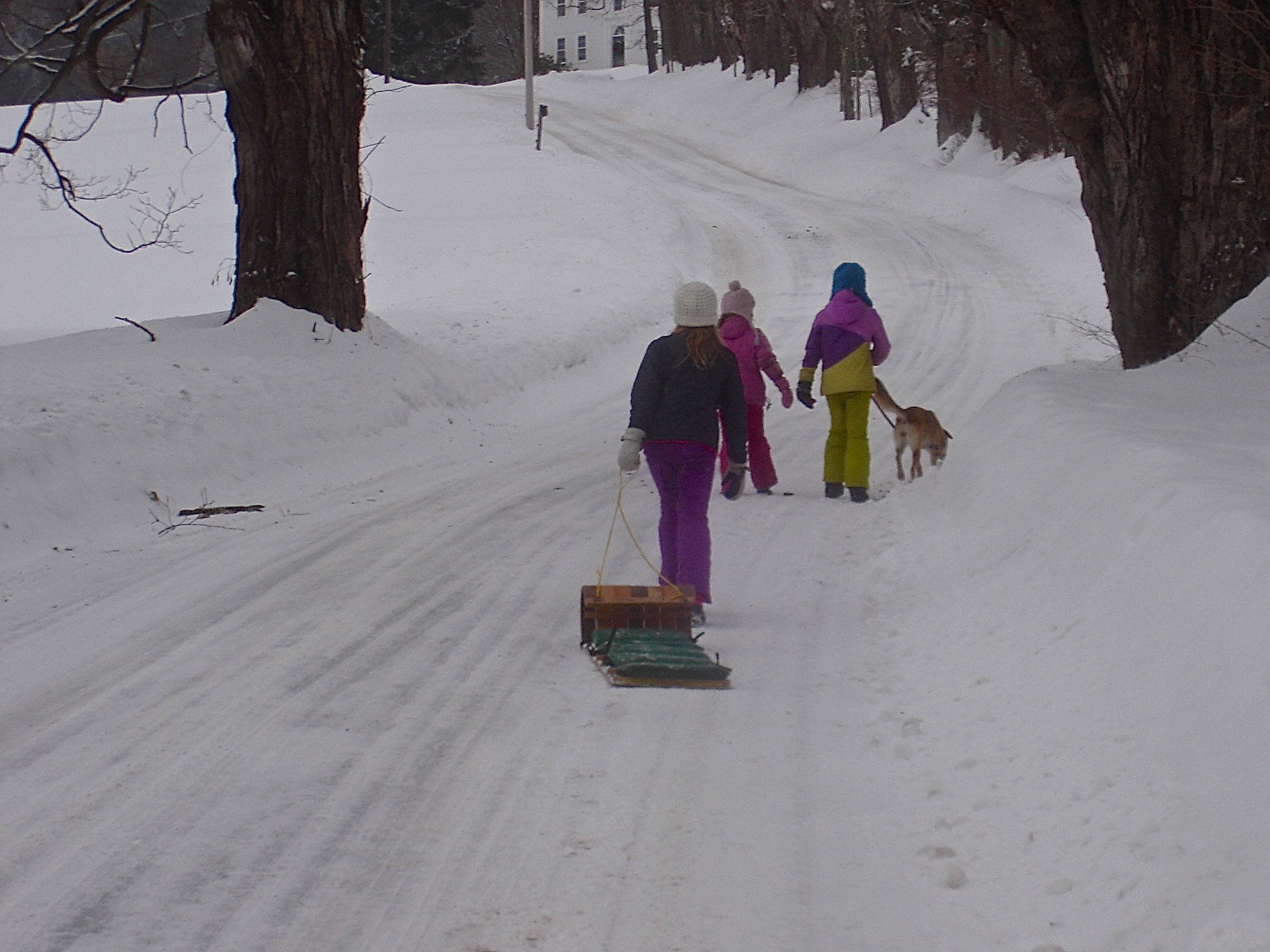 What do you do when it snows? Go sledding! My young neighbors (I think of them as my surrogate grandkids) joined us for an expedition to the top of our hill where there is a fine view and the open field is perfect for sledding.