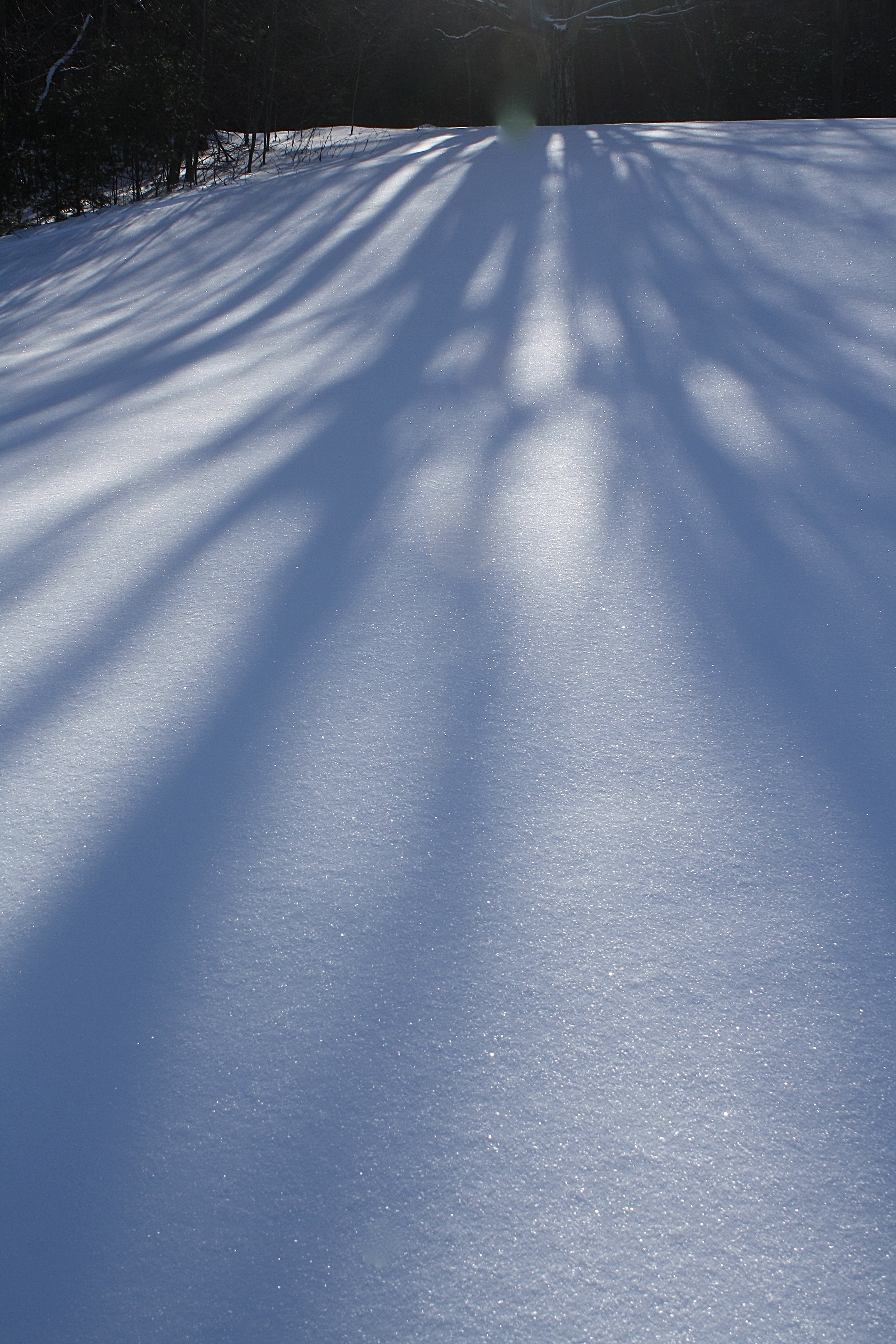 These photos of shadow on snow are like paintings, Eliza. What an incredible effect on the pristine snow! Do you paint? Your fourth photo, showing your own shadow, is my favorite. Such delicate lace shadows from the twigs 😉