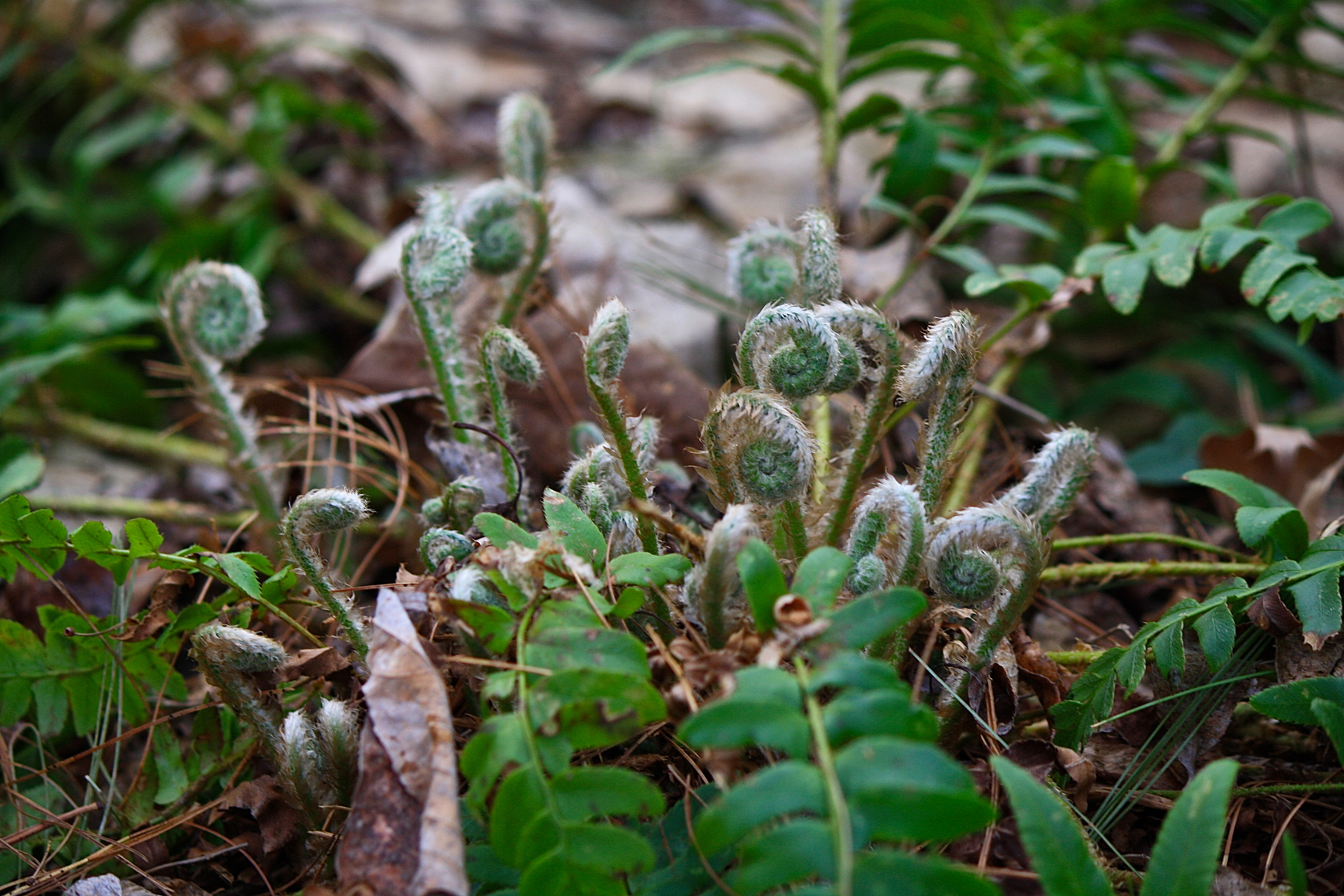 Even though there is an evergreen Christmas Fern (Polystichum acrostichoides) frond from last year in the background of the above photo, the white wooly fiddleheads here are Interrupted Ferns. Below are Christmas Fern fiddleheads, which unfurl symmetrically to form large circular mounds.