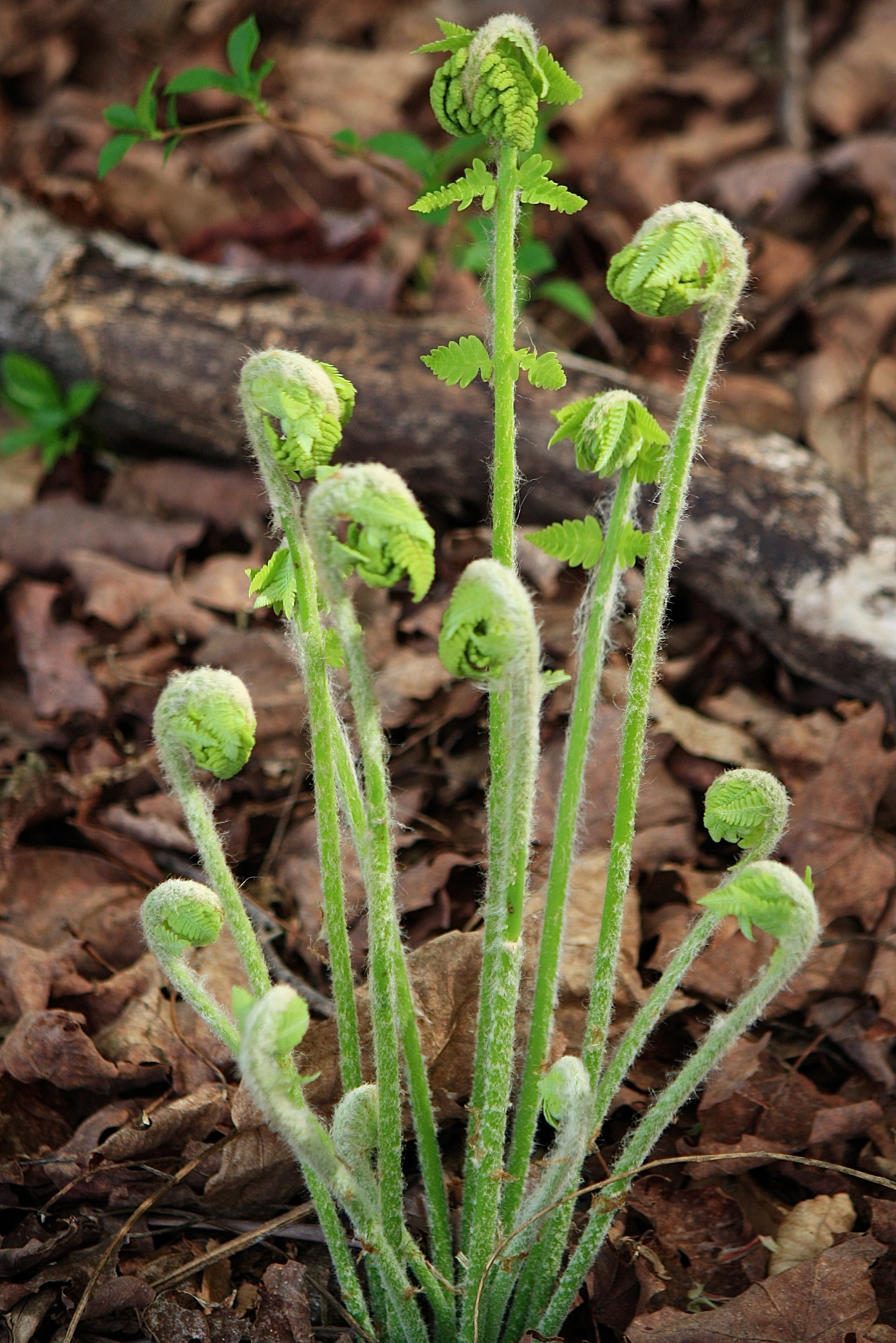 Lastly, are Cinnamon Fern fiddleheads (Osmunda cinnamomea), also wooly, but with a reddish-brown tinge to them. Some claim the name comes from the fertile fronds that rise up separately in early summer, looking a bit like cinnamon sticks, but technically, it refers to the brown fibers near the base of the plant.
