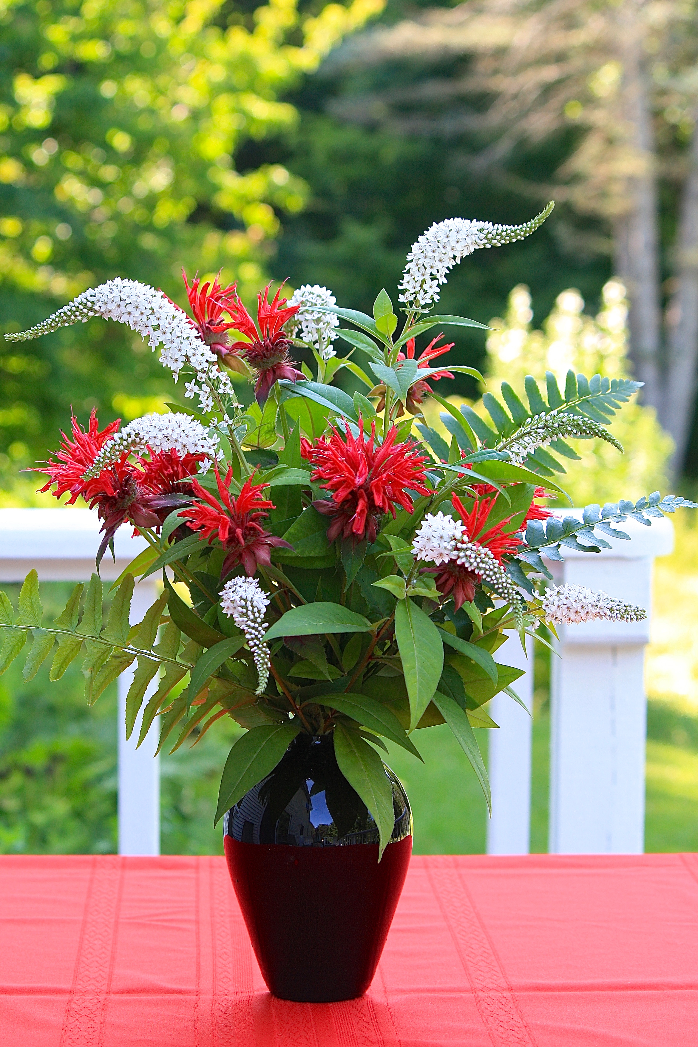 The white helps cool down the red-hot beebalm. A few Christmas fern fronds (Polystichum acrostichoides) were added for a green accent. An unadorned, Chinese-style, black glass vase compliments the simple design.