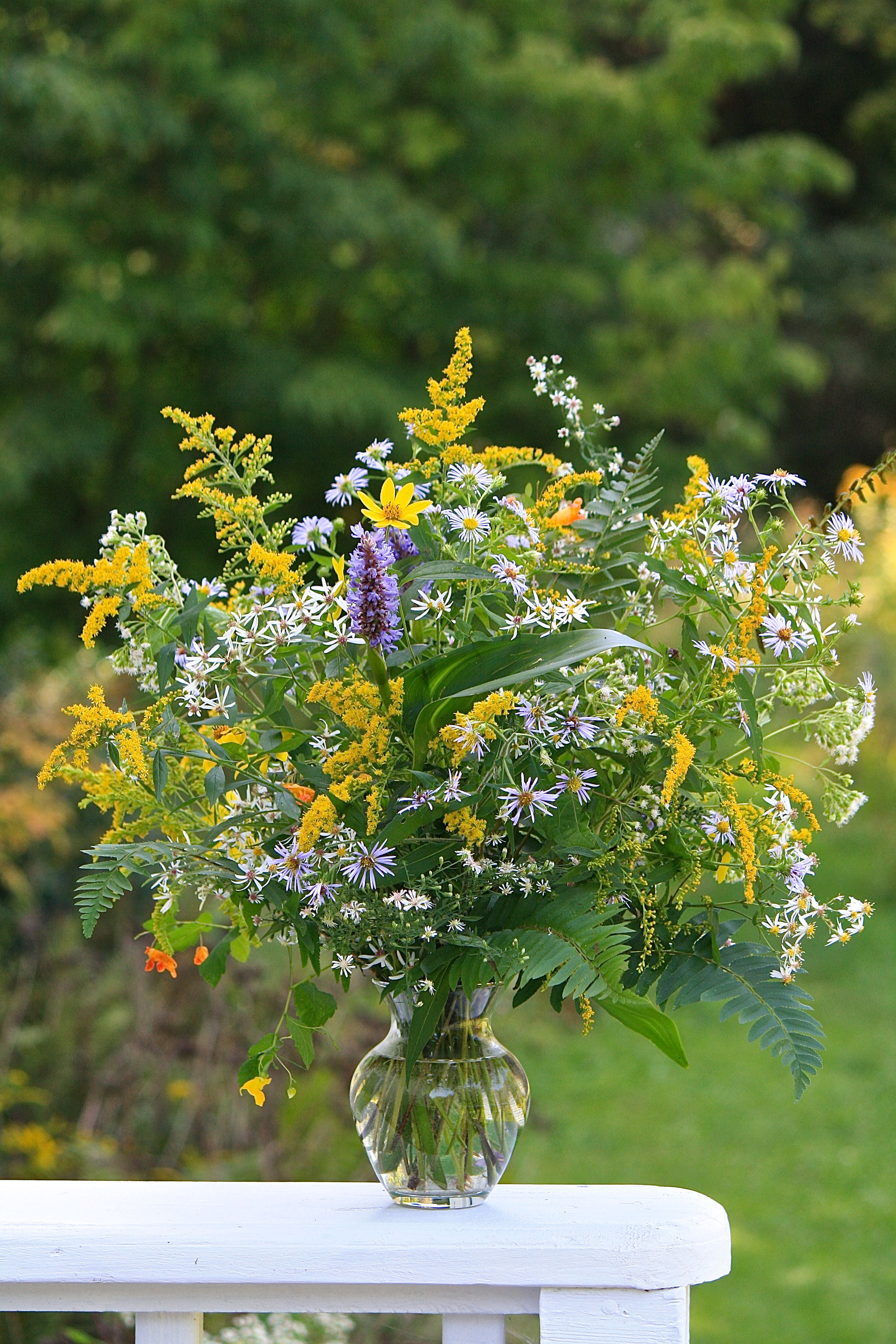 How wonderful to have such a beautiful collection of flowers growing wild around you! The arrangement made me smile as soon as I saw it. I have a few asters but the stems are too short and the flowers too few to do much with.