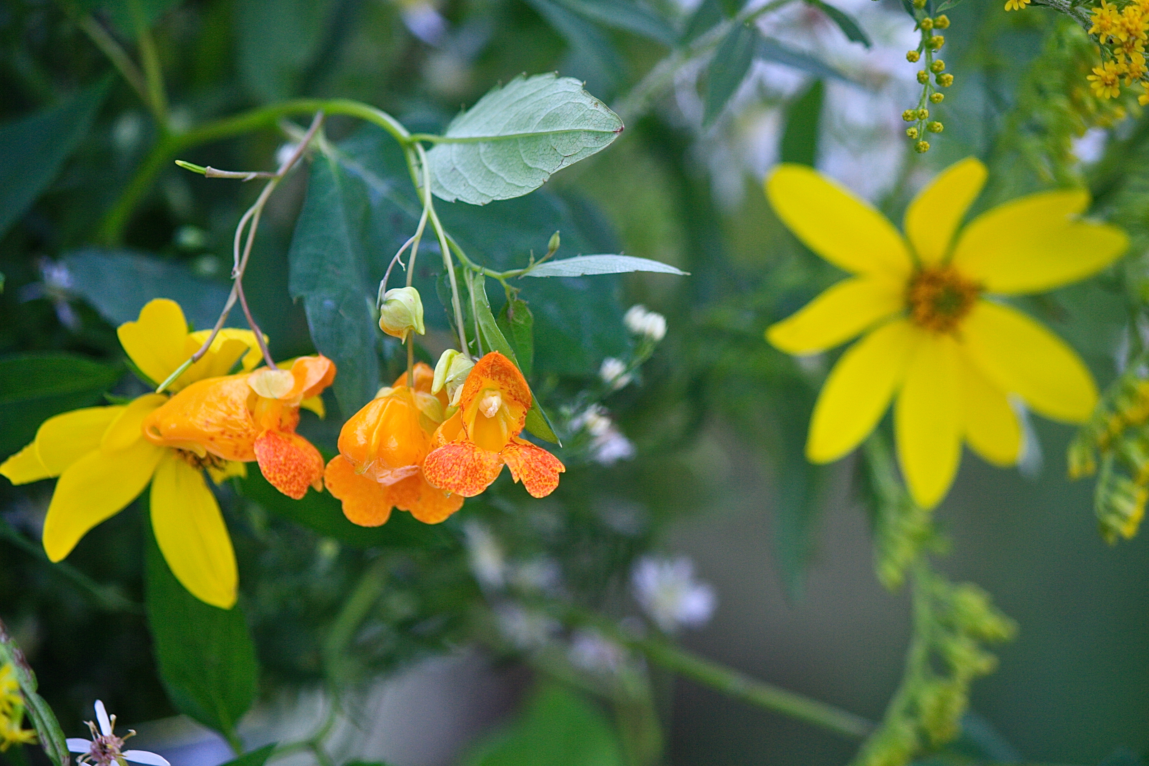 Orange and yellow jewelweed (Impatiens capensis and I. pallida) provide dots of warm color along with sprigs of goldenrod (Solidago sp.) and the last of the bright yellow daisies of woodland sunflower (Helianthus divaricata), which are going to seed, to the delight of the goldfinches and chickadees.
