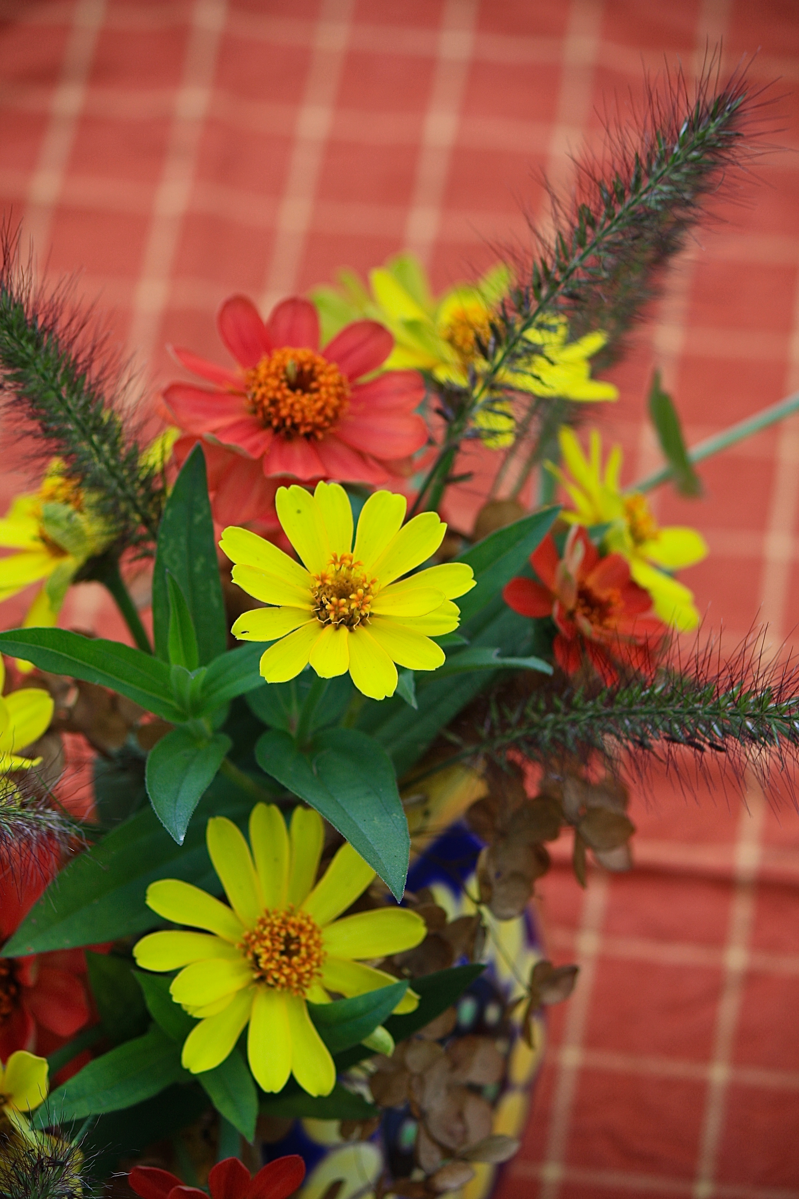 The first vase has Zinnia ‘Yellow Profusion’ (a GREAT garden performer) and the second has a sprig of goldenrod.