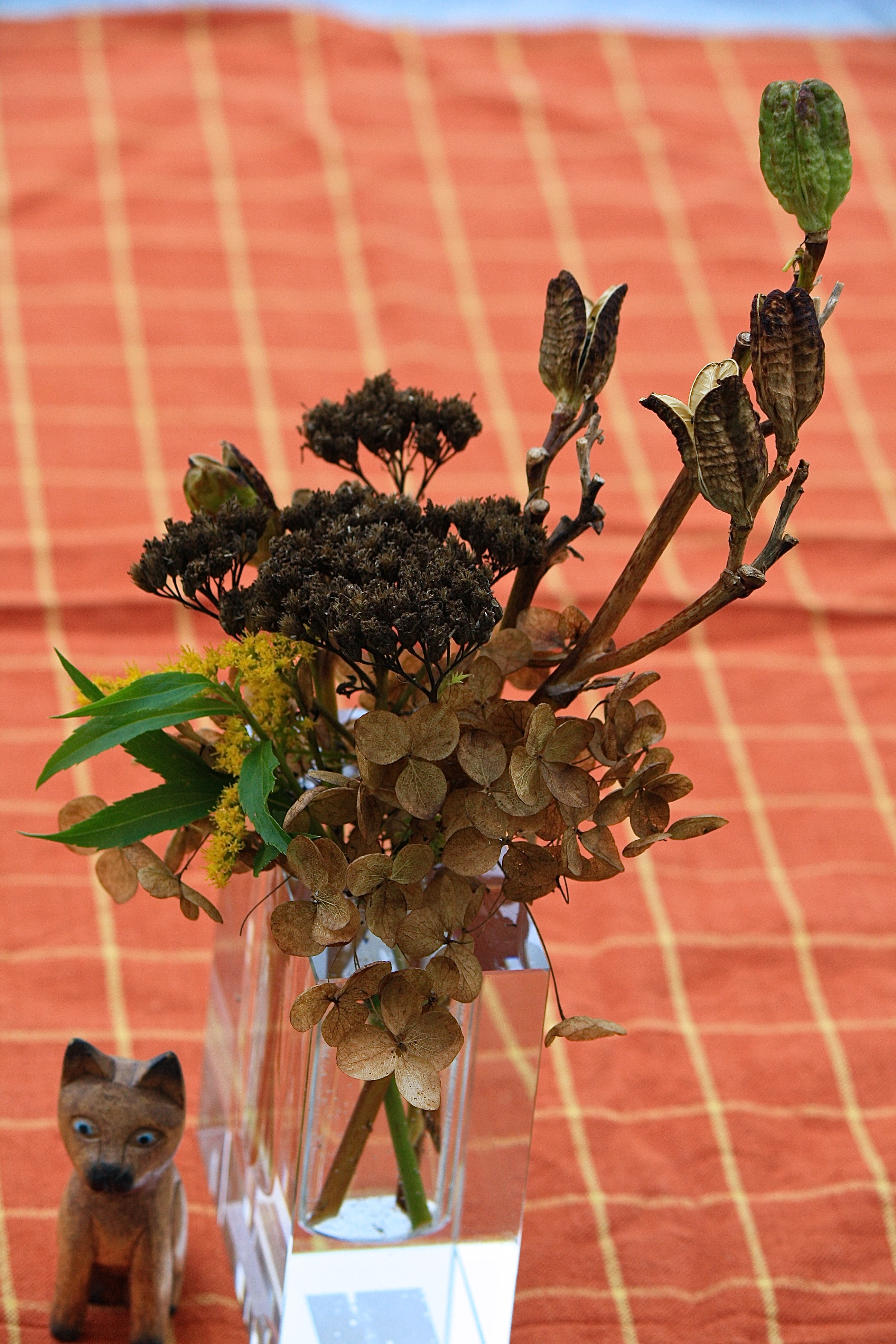 I picked dried seed heads of daylily (Hemerocallis sp.) and yarrow (Achillea millifolium) tucked in with more hydrangea. Experimenting with contrasting live green material, I used the fern-like leaves of cecily (Myrrhis odorata) and a small sprig of goldenrod (Solidago sp.). The hand-carved wooden cat was given to me many years ago by my son.