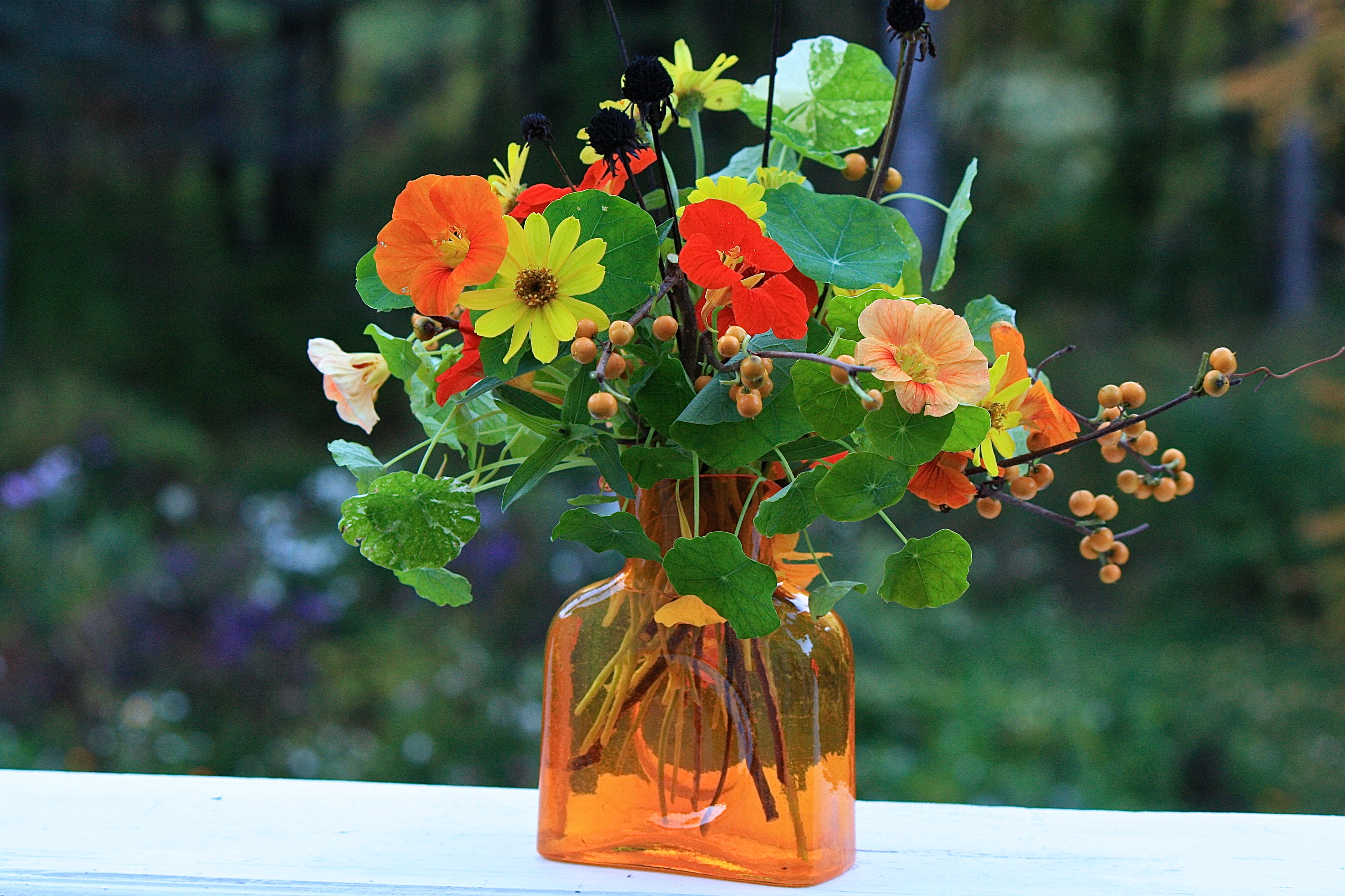Your lovely orange and red nasturtiums, and yellow zinnias, look so vivid, as well as the green leaves. The orange glass looks wonderful with the vivid colors, perhaps it’s the time of day.