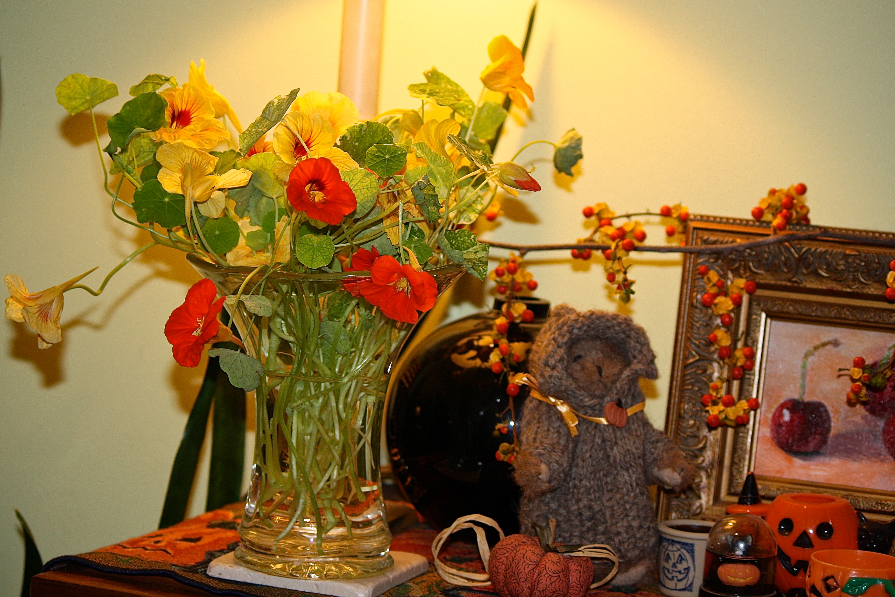 I placed the nasturtiums on the secretary where I have my Halloween display. That cute bear with a hand knit sweater and pumpkin button I got close to twenty years ago. It always warms my heart when I look at it!