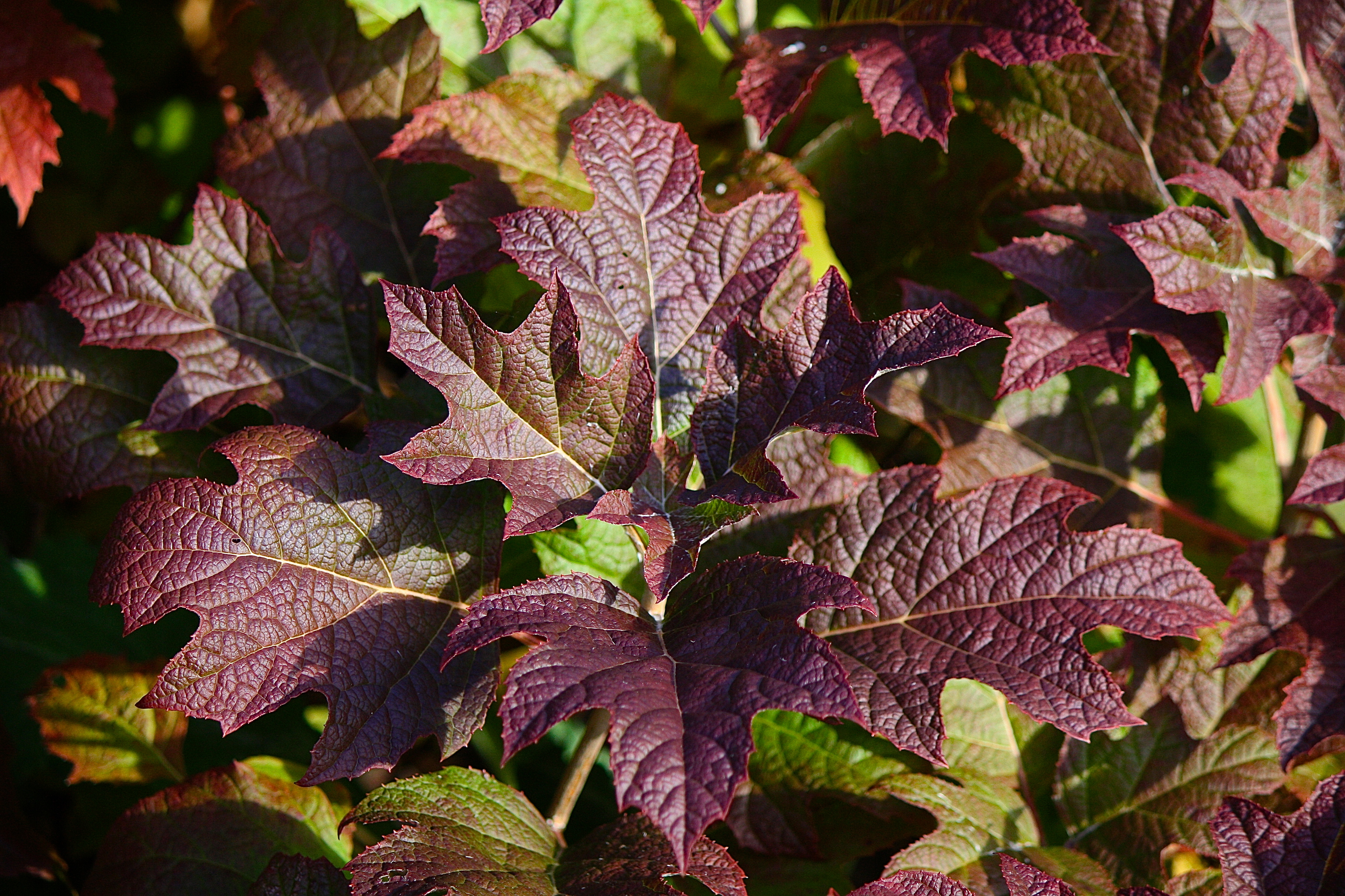 In the bed by the driveway, the oakleaf hydrangea (H. quercifolia) is coming into its glory as its foliage deepens to dark raspberry and purple.