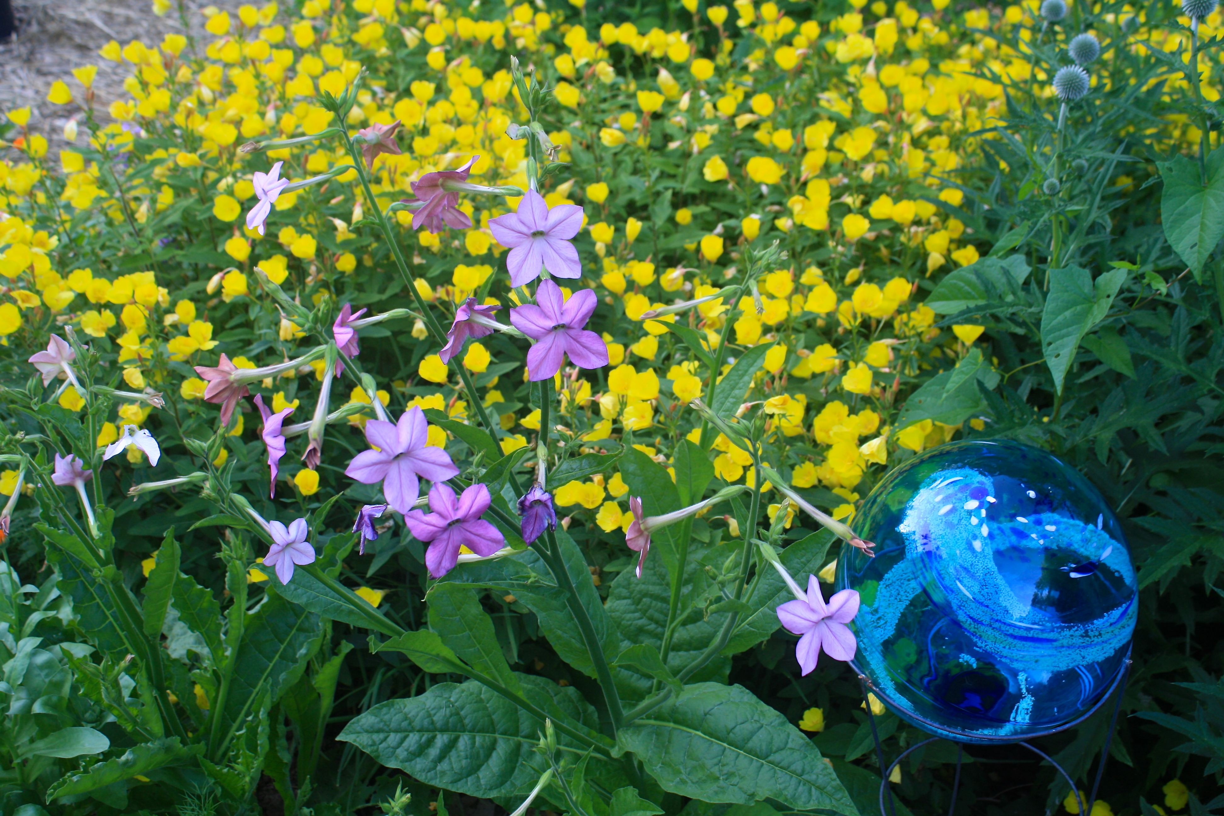 Pink Nicotiana alata and Sundrops (Oenothera fruticosa)