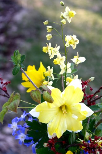Spring is grand, isn’t it? My irises are out, the roses are beginning to blossom, and the columbine have been lovely. There are also tiny zinnia seedlings in the garden. Your bouquet is really fabulous. I’m looking forward to more of them as it gets warmer.