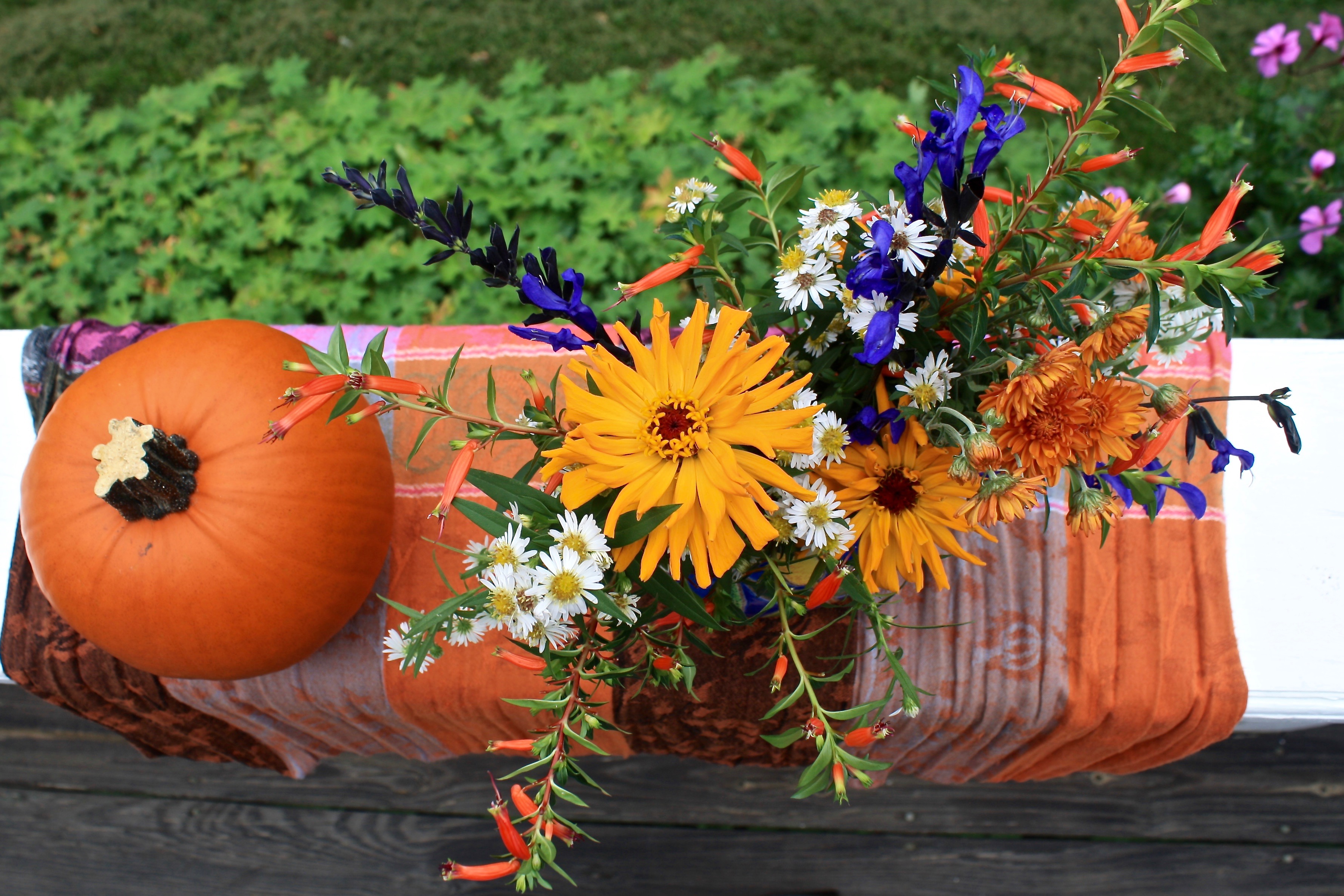 Top shot: Vase w/Cactus zinnia and pumpkin