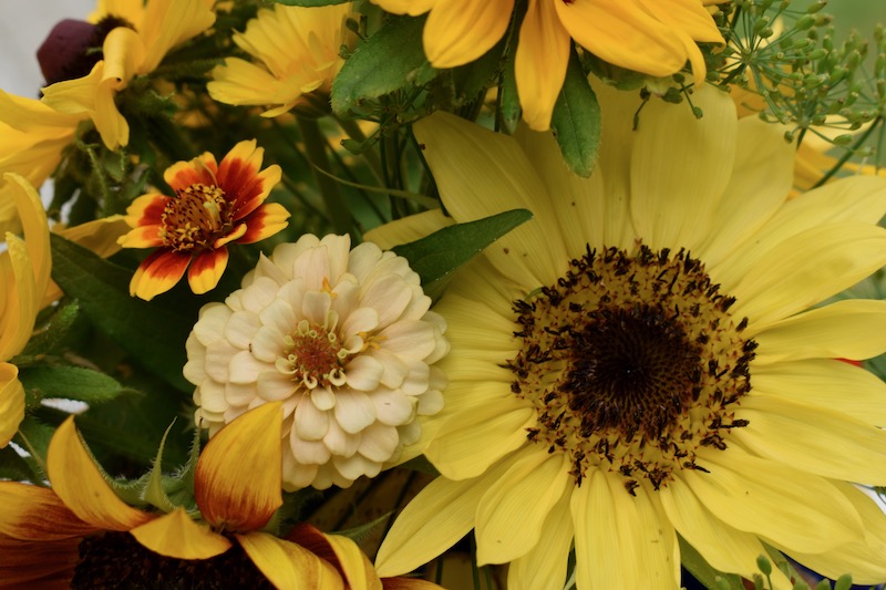 So many shades of yellow make for a lovely combination. What’s the pale one in the center? My guess is Zinnia of some sort. It’s a beautiful flower.