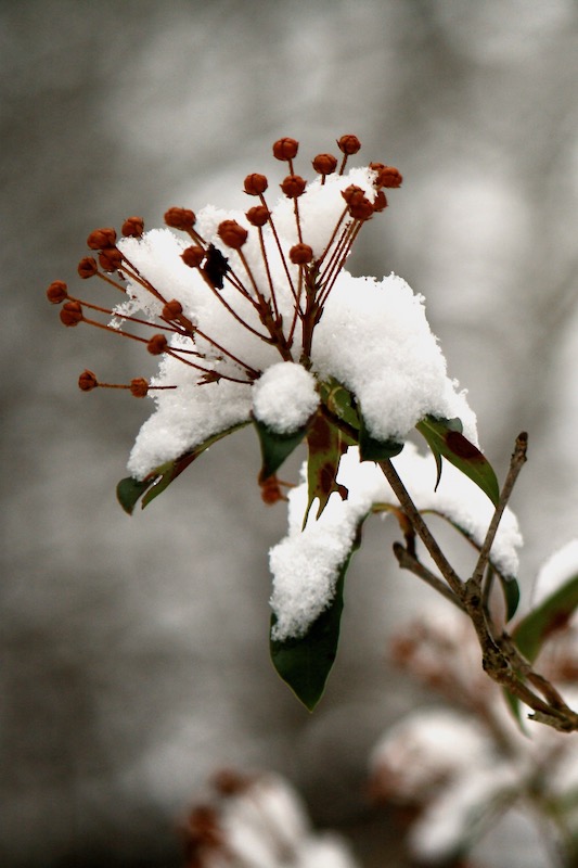 So pretty. I love the powdery snow, laden gently along those leaves. Lovely capture, Eliza!