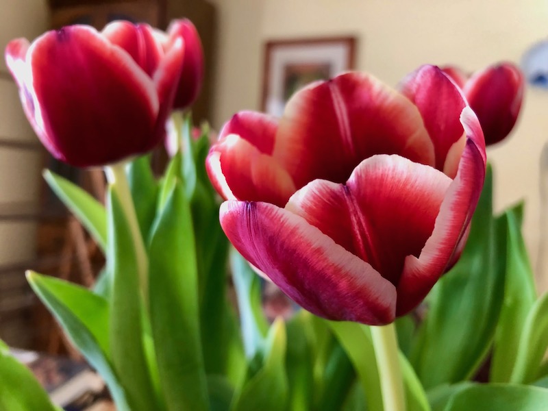 Thanks, Cathy. Those tulips were extra nice, I must admit. Not sure if the camera captured that they were almost a burgundy with a hint of orange at the base blending out to pale cream on the tips. As you can see outside we’re at the crocus and snowdrop stage. Scilla and chionodoxa, too. A few early daffs opened today, but with temps set to soar this week, things will leap ahead and the last of the snow in the shadows will be history!