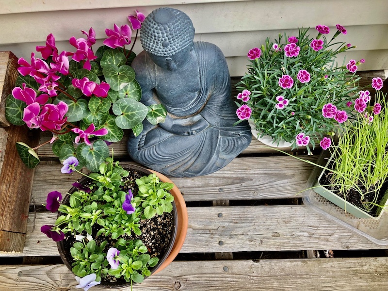 No, he is too serene to worry about spent blossoms. 😉 The gardener has to take care of that. 😀 The porch is warmer than the gardens, so these can stay put until the dianthus gets planted out, and the cyclamen goes dormant.