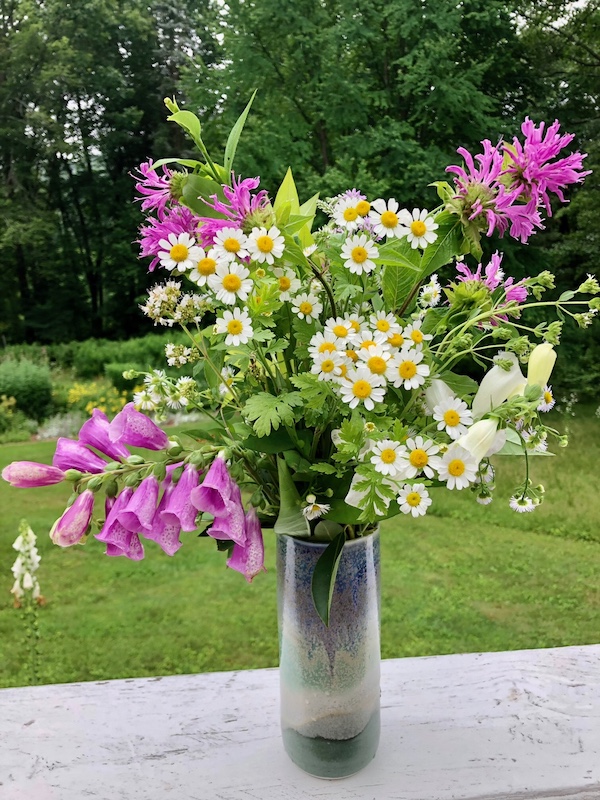 In the vase: feverfew (Tanacetum parthenium), daisy fleabane (Erigeron annuus), oregano blossoms (Origanum vulgare), gooseneck loosestrife (Lysimachia clethroides), pink beebalm (Monarda didyma) and spiked speedwell (Veronica spicata), pink and white foxglove (Digitalis purpurea /alba).