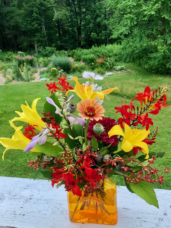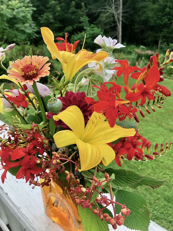With Crocosmia ‘Lucifer’ at peak bloom, I picked other flowers that complemented them… the maturing stems and fruit of Doublefile Viburnum (V. plicatum var. tomentosum), Hemerocallis ‘Hyperion’, Hosta flowers; single stems of Marshmallow (Althaea officinalis), Dahlia ‘Voodoo’, Zinnia elegans and a few Poppy (Papaver somniferum) seed heads as accent.