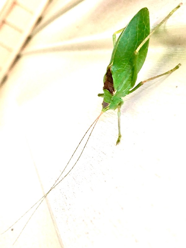 Almost endless antennae. Often well-camouflaged on green leaves. Very loud. The only ones allowed to nibble my flowers. One of my favorite insects.