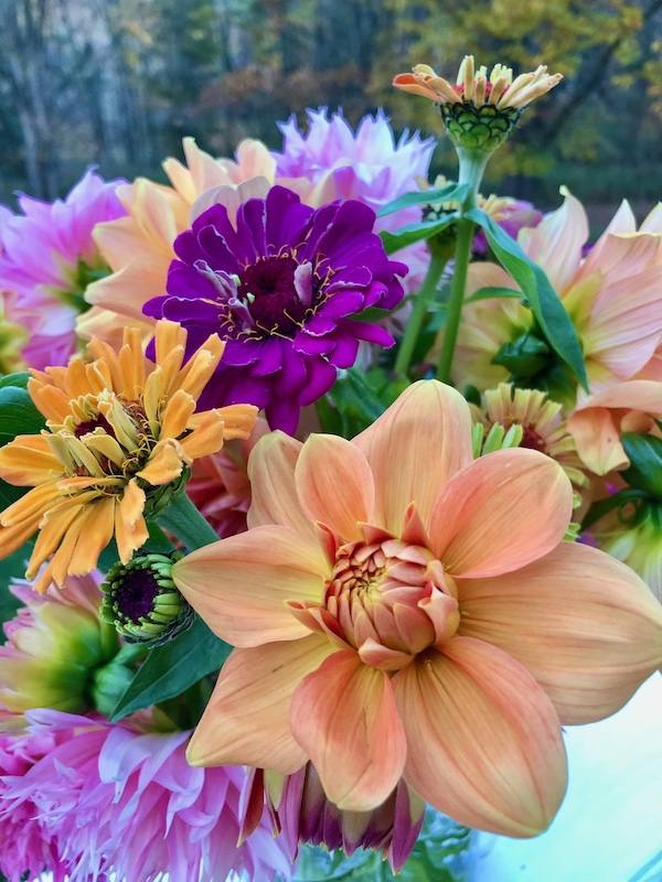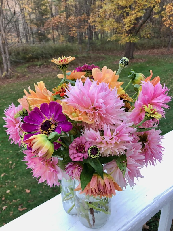Beautiful flowers again, Eliza. Those peachy dahlias and sassy zinnias are great together. Interesting how your cold weather has held off this year. Everyone seems to be looking at a similar forecast this week.