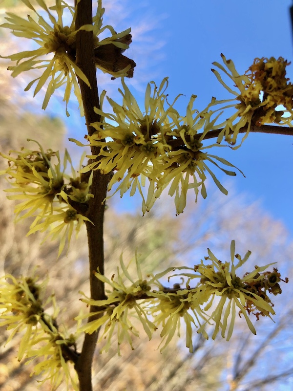 My spouse always says “the first sign of spring!” when the witch hazel blooms (in the fall). 😊