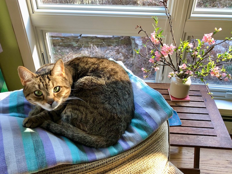 That is so pretty Eliza! I denied myself a Quince shrub for years as those thorns are fierce, but succumbed in the end and am now wondering if it will bear flowers this year…. Great idea to keep it trimmed and bring some indoors to force. 😃 And Annie has found the warmest spot by the looks of things!