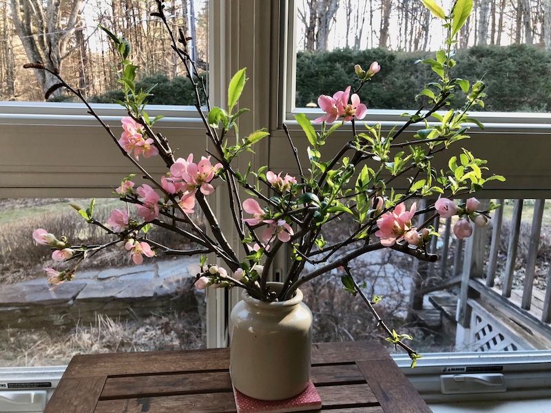 Two cheerful sights to brighten your day, sweet Annie and a pretty vase of quince blossoms. And you will have snow in the background come Wednesday? Spring in New England!