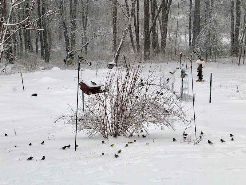 A little of 5″… north and east of us got over a foot. The big birdie customers of the day were juncos and finches. Lots of activity!