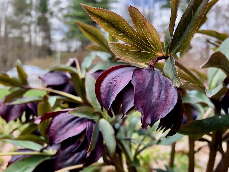 A deep rich hue to your hellebore – I see many white ones, but not colors like these. And the photo show the foliage well, too.