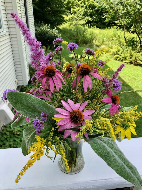It’s so hard to believe people already are talking about the end of summer. At least our unrelenting heat means high pressure, which means no hurricanes — for the present, anyway. I’d much rather enjoy the colors in your bouquet than the colors on a surge map! The orange and pink in the coneflowers is especially nice.