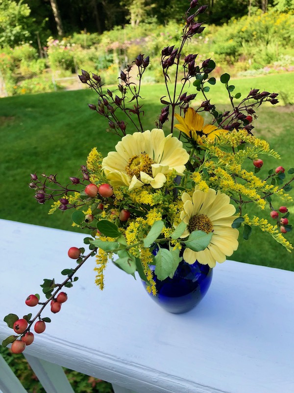 The season of seeds and fruits is upon us. Today’s vase shows Cotoneaster berries and ruby-red Penstemon ‘Husker’s Red’ seed heads. Goldenrod (Solidago sp.), pale yellow Zinnia elegans and beach sunflower (Helianthus debilis) complete the arrangement.
