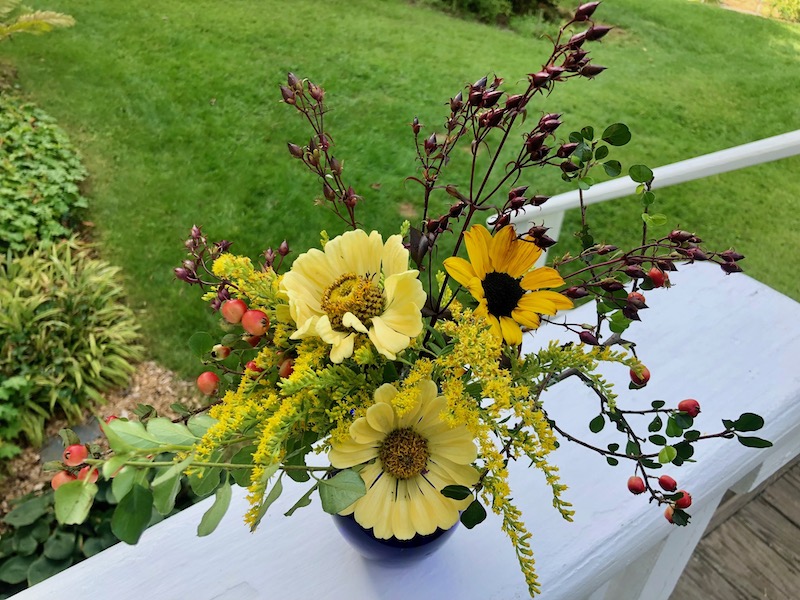 The season of seeds and fruits is upon us. Today’s vase shows Cotoneaster berries and ruby-red Penstemon ‘Husker’s Red’ seed heads. Goldenrod (Solidago sp.), pale yellow Zinnia elegans and beach sunflower (Helianthus debilis) complete the arrangement.