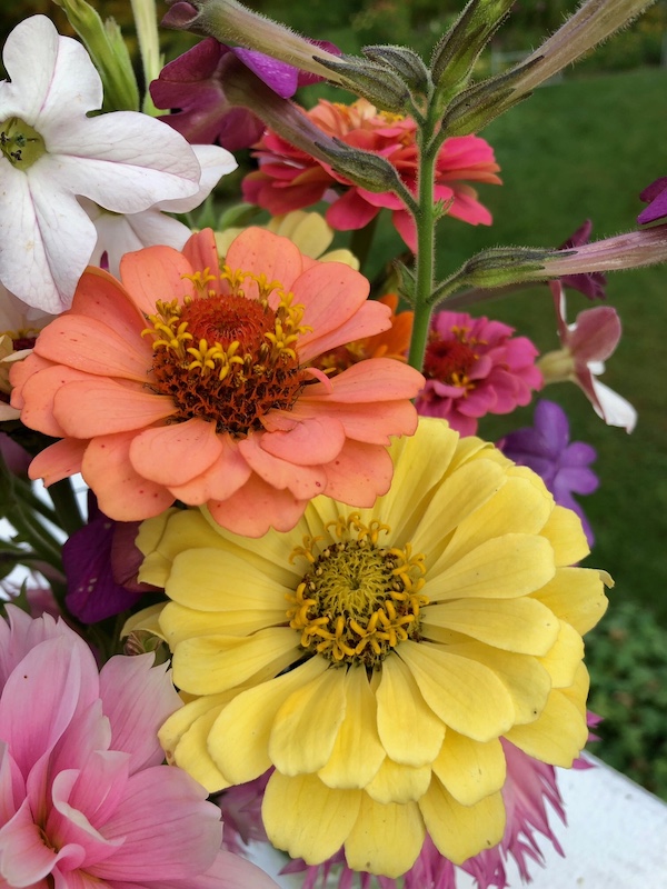 While zinnias (Z. elegans) and dahlias (D. ‘Pinelands Princess’ and ‘Chilson’s Pride’) predominate this week’s arrangement, there are also flowering tobacco (Nicotiana alata) and cosmos (C. bipinnatus).