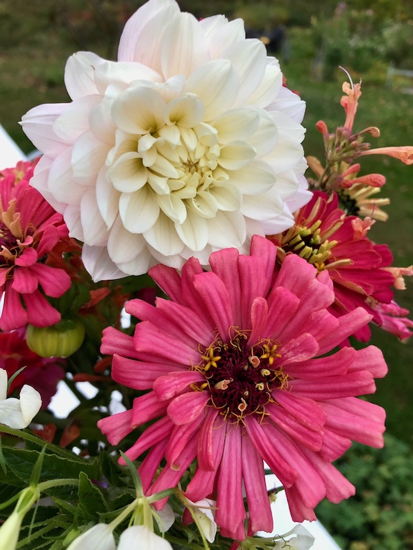 Here is #2: A mix of pink Zinnia elegans, Dahlia ‘Chilson’s Pride’, white yarrow (Achillea millefolium), with accents of a few sprigs of cigar plant (Cuphea ignea ‘Vermillionaire’) and hummingbird mint (Agastache ‘Poquito’).