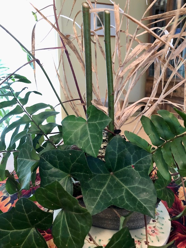 I wandered my flowerless yard searching for something to create an arrangement with and chose evergreen English ivy (Hedera helix) and Christmas fern (Polystichum acrostichoides), as well as some dried grasses and two green multiflora rose canes cut and arranged to form an ’11’ stuck into a vintage pewter flower frog.