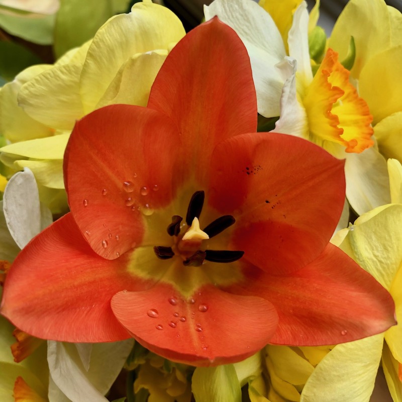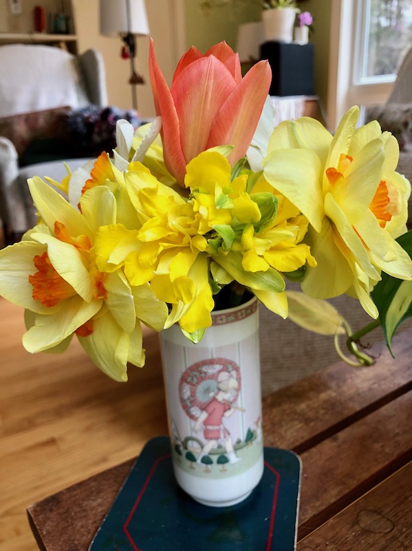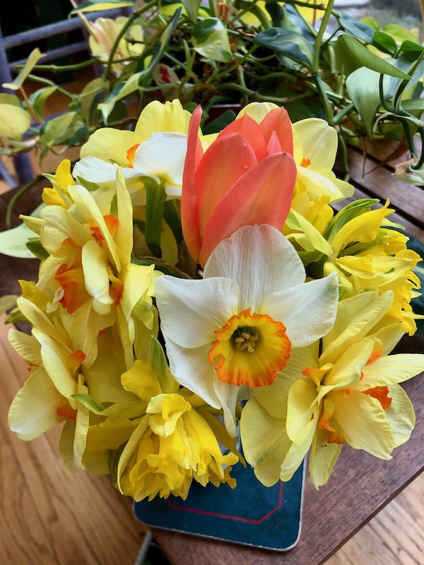 My yard is abloom with many kinds of Narcissus, planted over the several decades that we’ve lived here. Yesterday’s rain pushed a few down onto their faces, so I plucked a handful for a vase. I added one ‘Apricot Emperor’ tulip to the center.