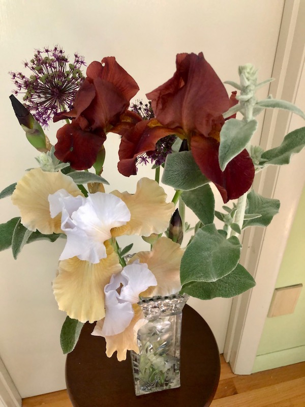 Bearded Iris (I. germanica) have dominated the garden this week and I’m enjoying my root beer-colored cultivar (a passalong, so no ID), as well as a new edition: ‘Champagne Elegance.’ Also in the vase are a couple soon-to-pass Allium atropropureum, and a few lamb’s ears (Stachys byzantina) budded stems.