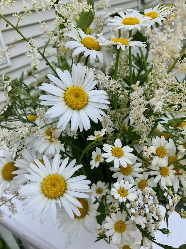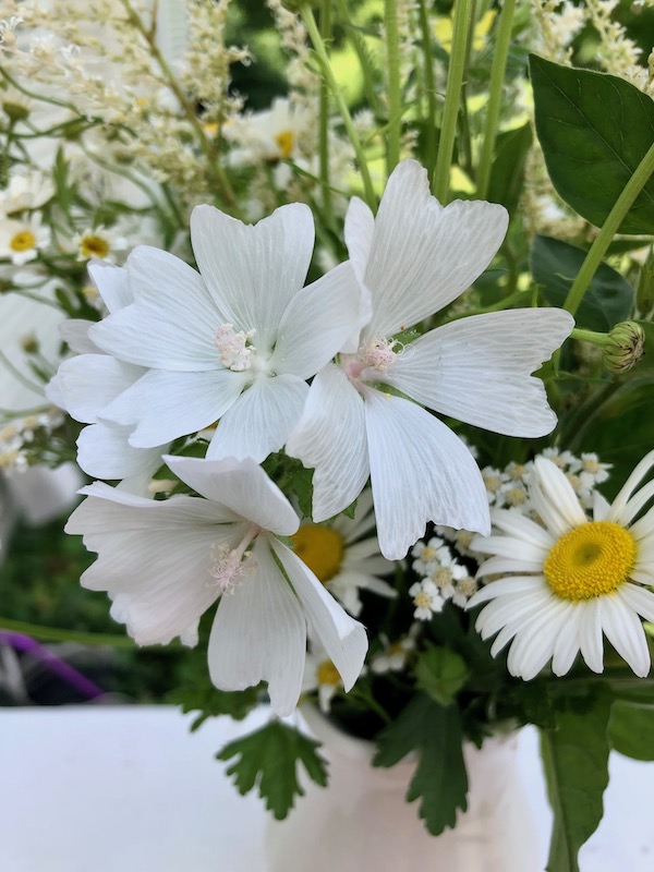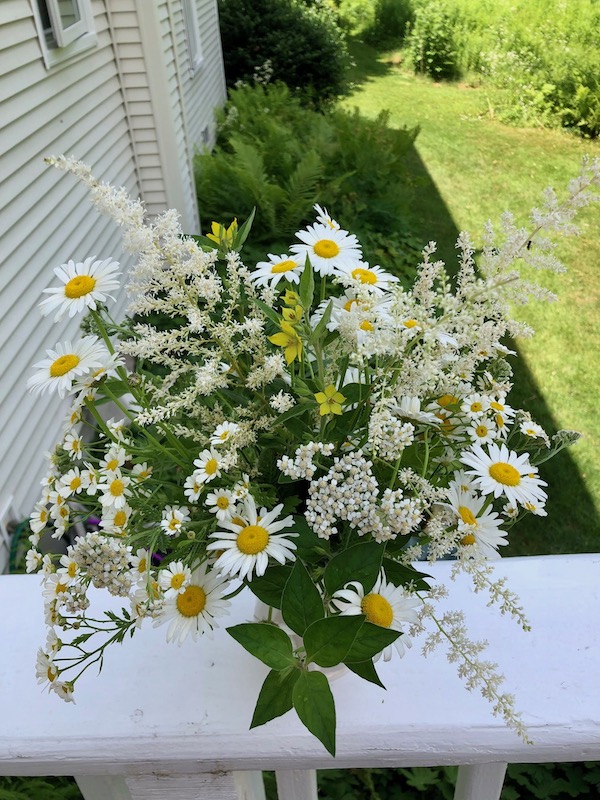 To celebrate the sunny days of early summer, a vase of composites– oxeye daisies (Leucanthemum vulgare), feverfew (Tanacetum parthenium) and white yarrow (Achillea millifolium) are accompanied by white astilbe (A. chinensis), white mallow (Malva moscheutos) and stars of yellow loosestrife (Lysimachia punctata).