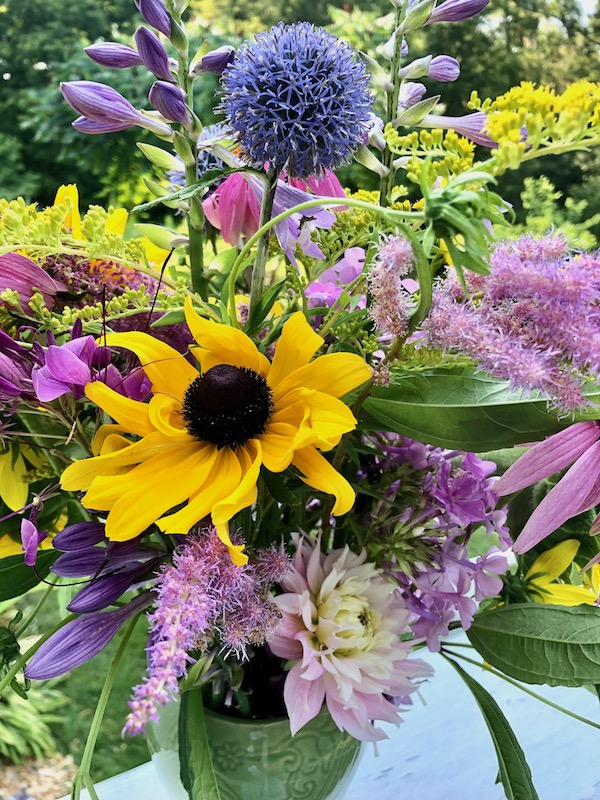 I’m glad to see that your battles with extreme heat didn’t have ill effects on the bounty of your garden, Eliza. I love the exuberance of today’s arrangement. And I envy your sunflowers! I thought I had sunflower seeds on hand to sow this year and belatedly discovered that my memory was faulty.