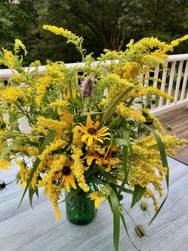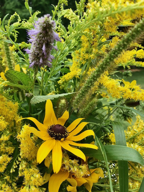 A second vase of natives offers an even wilder look in yellow-gold with a couple of blue accents: goldenrod (Solidago sp.), black-eyed Susan (Rudbeckia hirta), woodland sunflower (Helianthus divaricata), yellow foxtail grass (Setaria sp.), anise hyssop (Agastache foeniculum) and seed heads of love-in-a-mist (Nigella damascena).