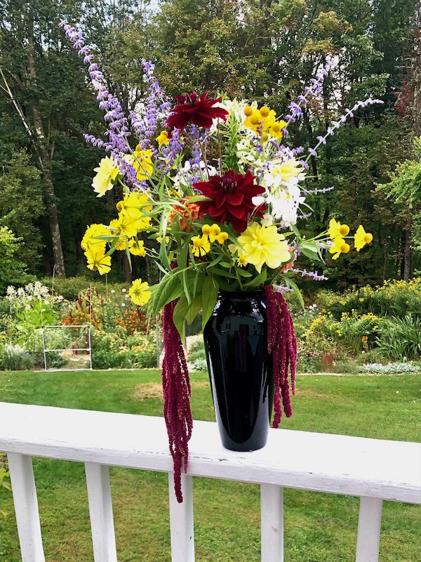 Love the Dahlias, Liza, and I have never seen the love-lies-bleeding (Amaranthus caudatus), and they look great… never thought about an arrangement “flowing down the sides” – beautiful.